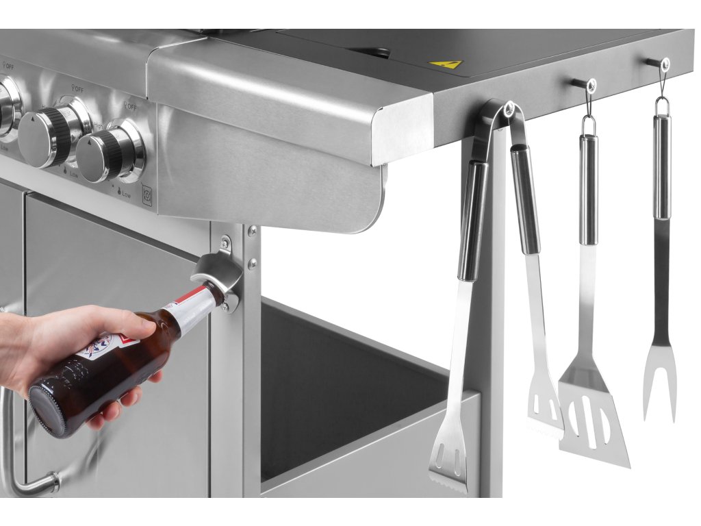 Și asta nu este sfârșitul echipamentului furnizat de grătarul Teesa. Aparatul are, de asemenea, cârlige practice pe care puteți agăța accesoriile necesare. În plus, grătarul este dotat cu un deschizător de sticle! Merită menționată și dulapul, care vă permite să păstrați ordinea în jurul suprafeței de lucru.