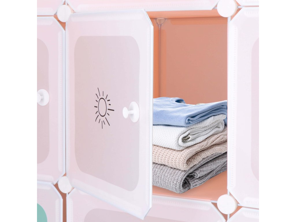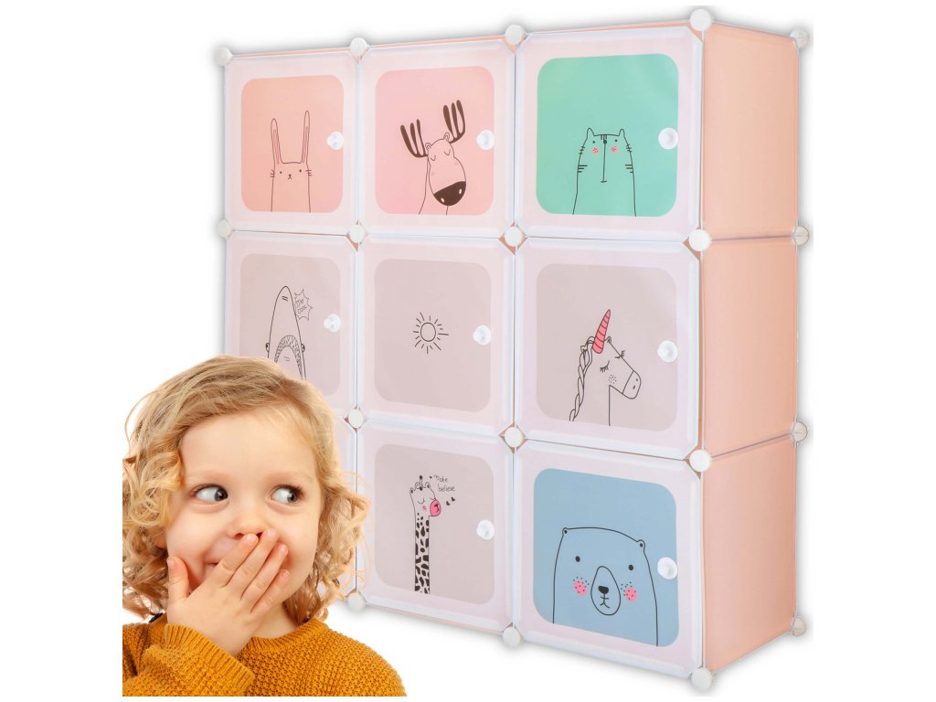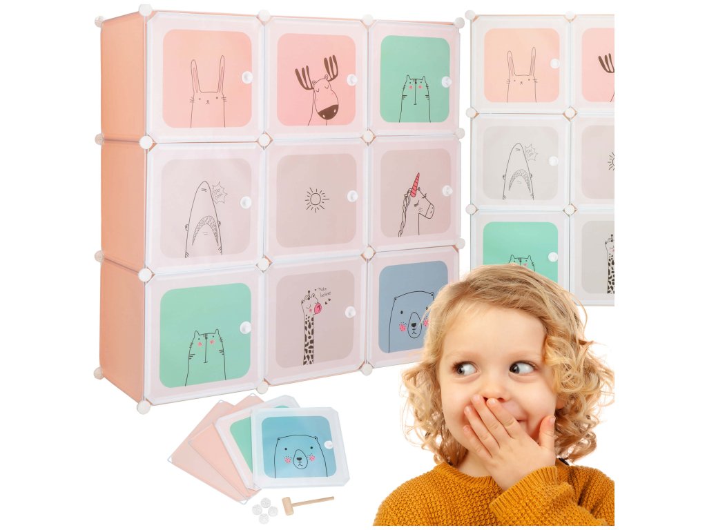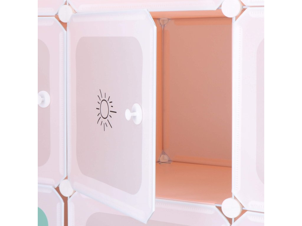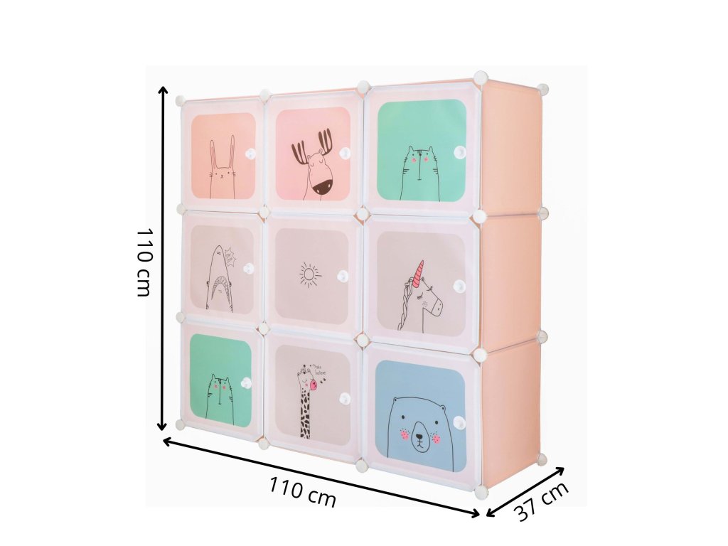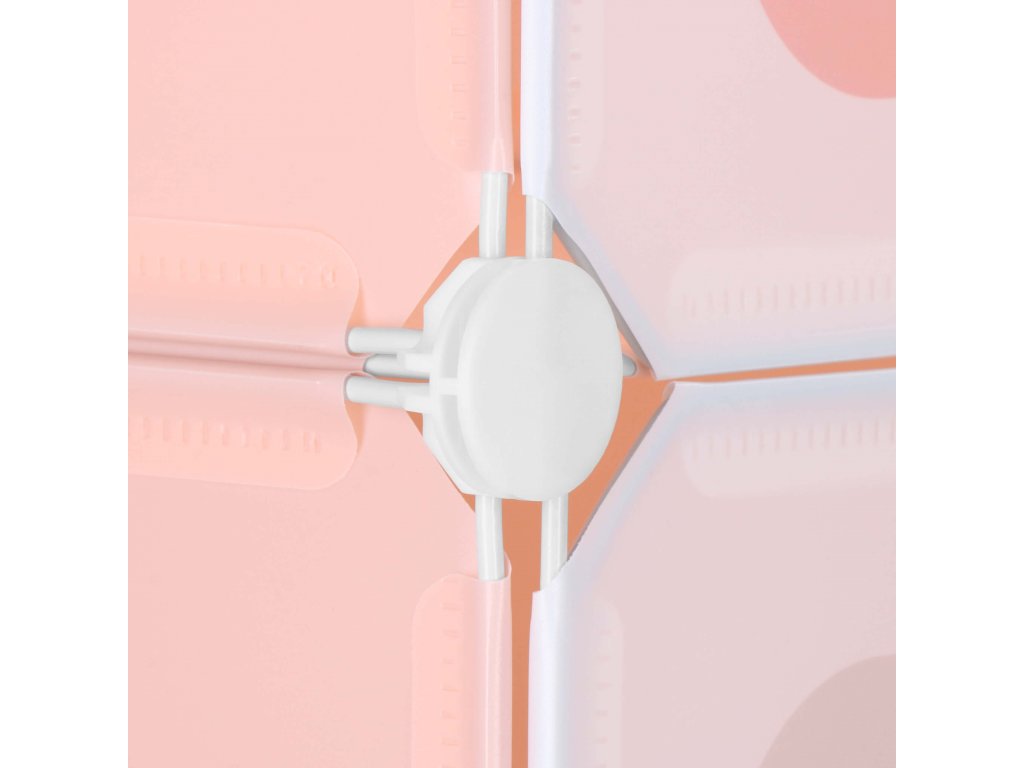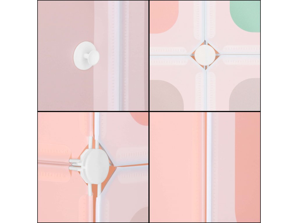 - Setul conține: 33 pătrate de culoare roz / 9 uși cu imprimeu / 32 colțuri / 9 cleme pentru uși / 9 mânere pentru operarea ușilor dulapului / ciocan din lemn