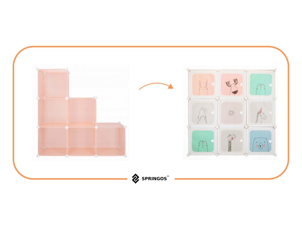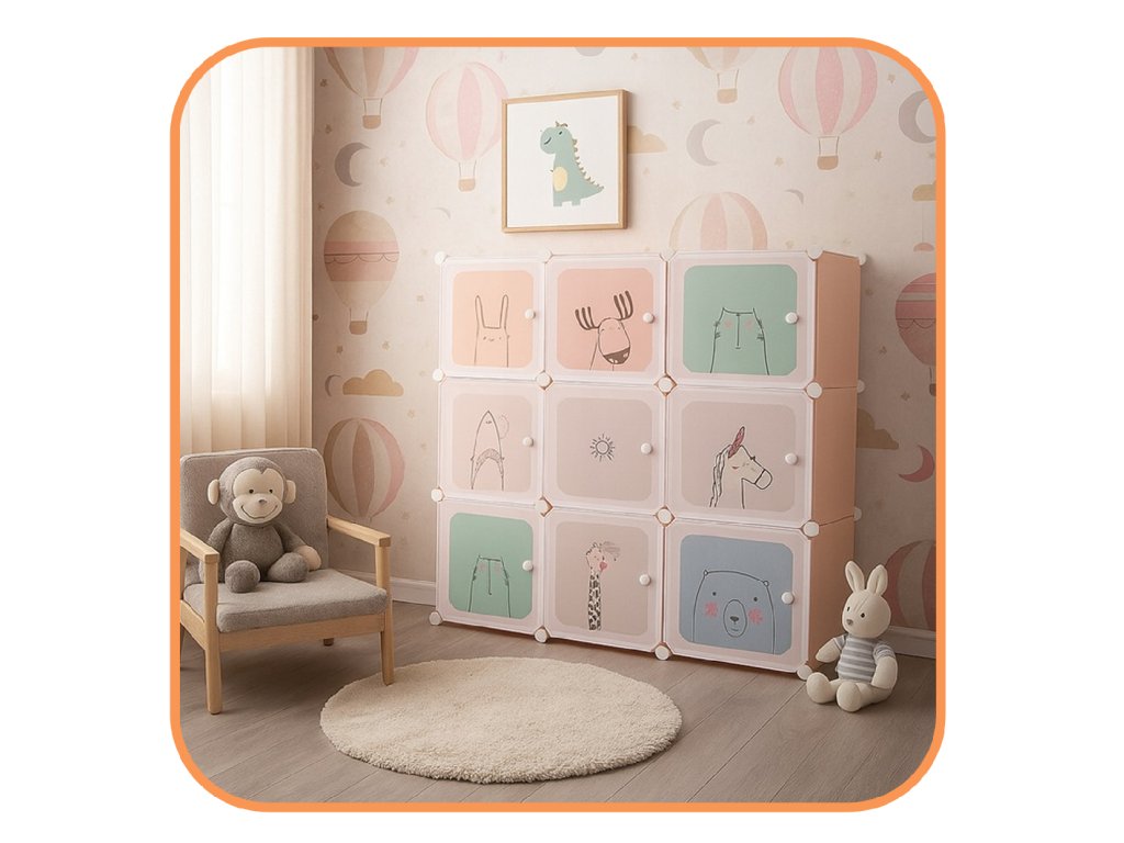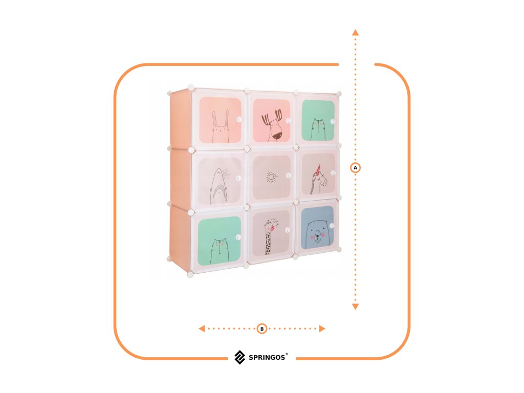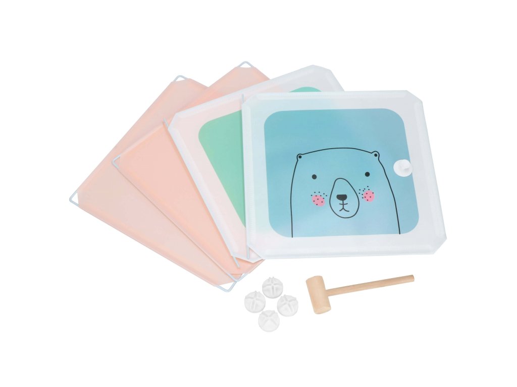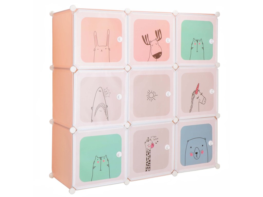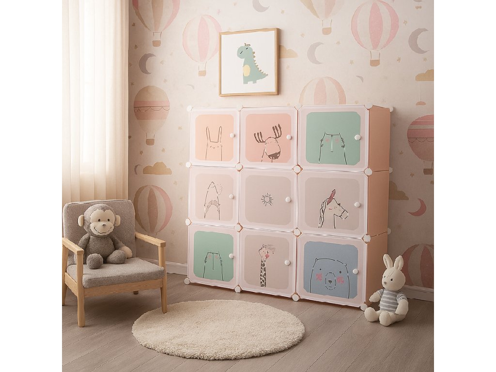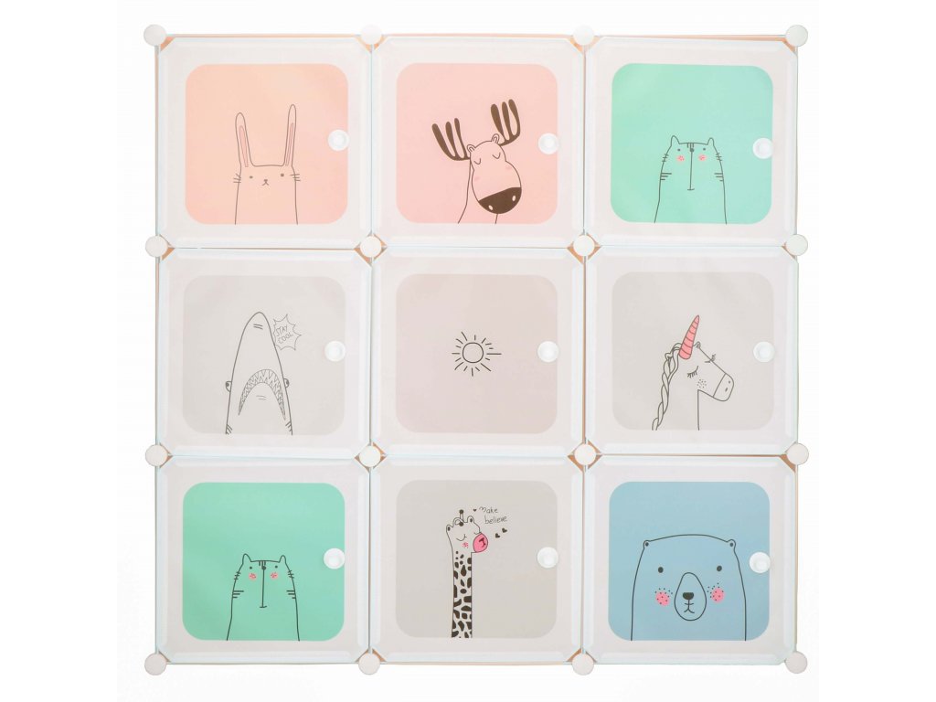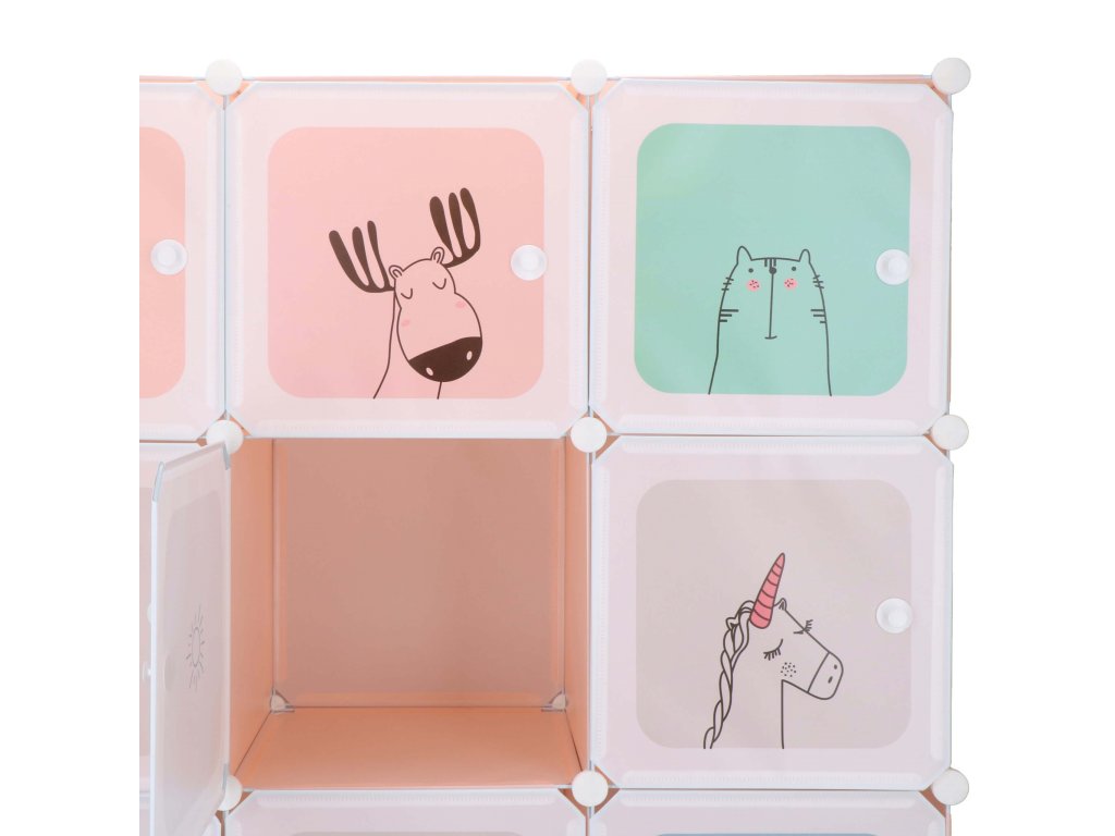 - Setul conține: 33 pătrate de culoare roz / 9 uși cu imprimeu / 32 colțuri / 9 cleme pentru uși / 9 mânere pentru operarea ușilor dulapului / ciocan din lemn