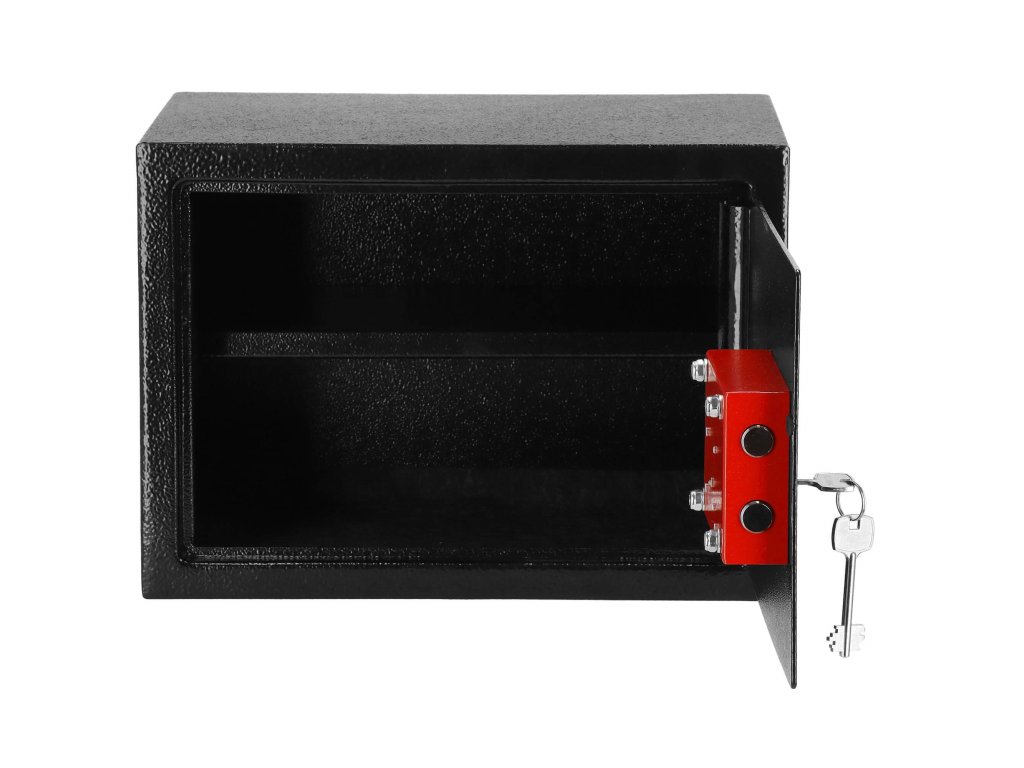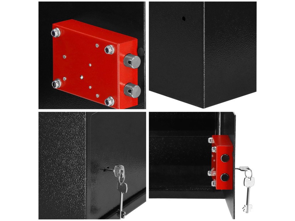 - În plus: posibilitatea de fixare pe pereți și podea (diblu inclus), raft interior detașabil, covoraș de pâslă pentru a reduce zgomotul interiorului seifului