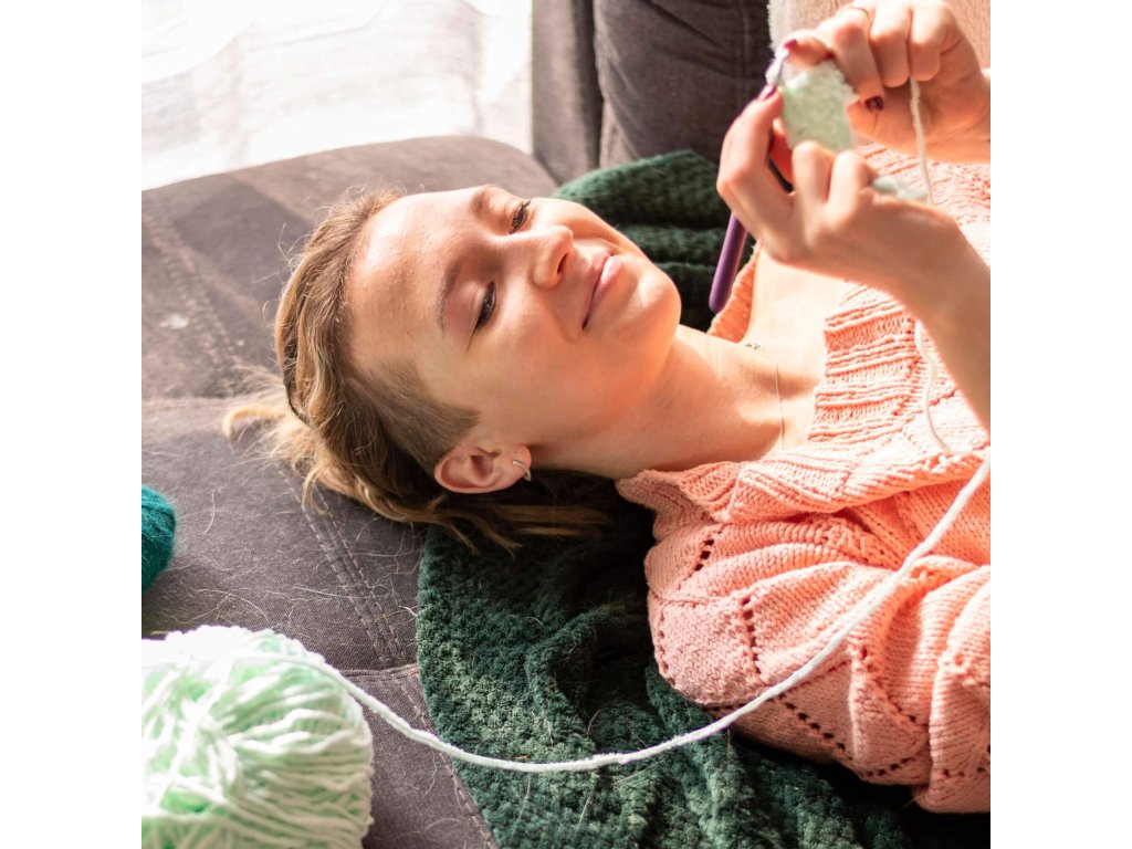 Set de cârlige colorate într-o carcasă transparentă cu compartimente.