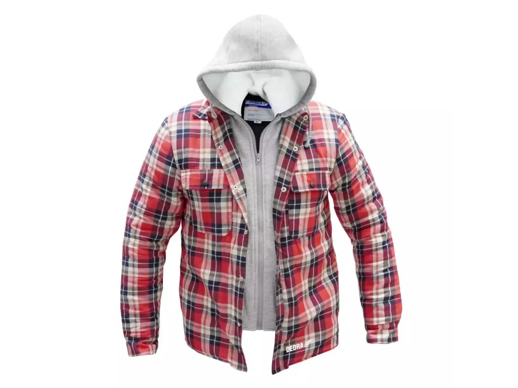 Geaca din flanel este realizată din 100% bumbac cu o greutate de 105 g/m în stratul superior. Gluga cu căptușeală din fleece și inserțiile gri sunt realizate din 80% poliester și 20% bumbac cu o greutate de 280 g/m . Bluza este umplută cu umplutură de poliester. Datorită cantității diferite de umplutură, bluza este confortabilă și potrivită termic. Corpul este căptușit cu 140 g umplutură și mânecile cu 120 g umplutură. Datorită taftului (căptușeală alunecoasă pe trunchi și mâneci), mânecile nu se ridică atunci când porți geaca. Bluza se închide cu nasturi pe partea superioară și cu fermoar pe partea interioară. Bluza are două buzunare la piept și două buzunare laterale deschise. Mansetele gecii sunt deschise și au închidere cu capse, iar partea din spate este rotunjită. Logo-ul DEDRA pe partea din față a hanoracului. Disponibil în mărimile S-XXXL.