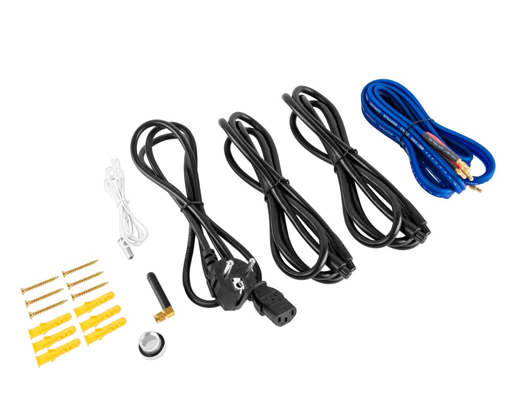 Include: 2 cabluri difuzoare frontale, cablu subwoofer, cablu de alimentare, antenă Bluetooth, cablu antenă FM, 2 suporturi de montare pentru difuzoare frontale, 2 suporturi pentru difuzoare frontale, 6 șuruburi, 6 dibluri, 2 cleme de montare, 2 șaibe, telecomandă, mănuși, instrucțiuni de utilizare