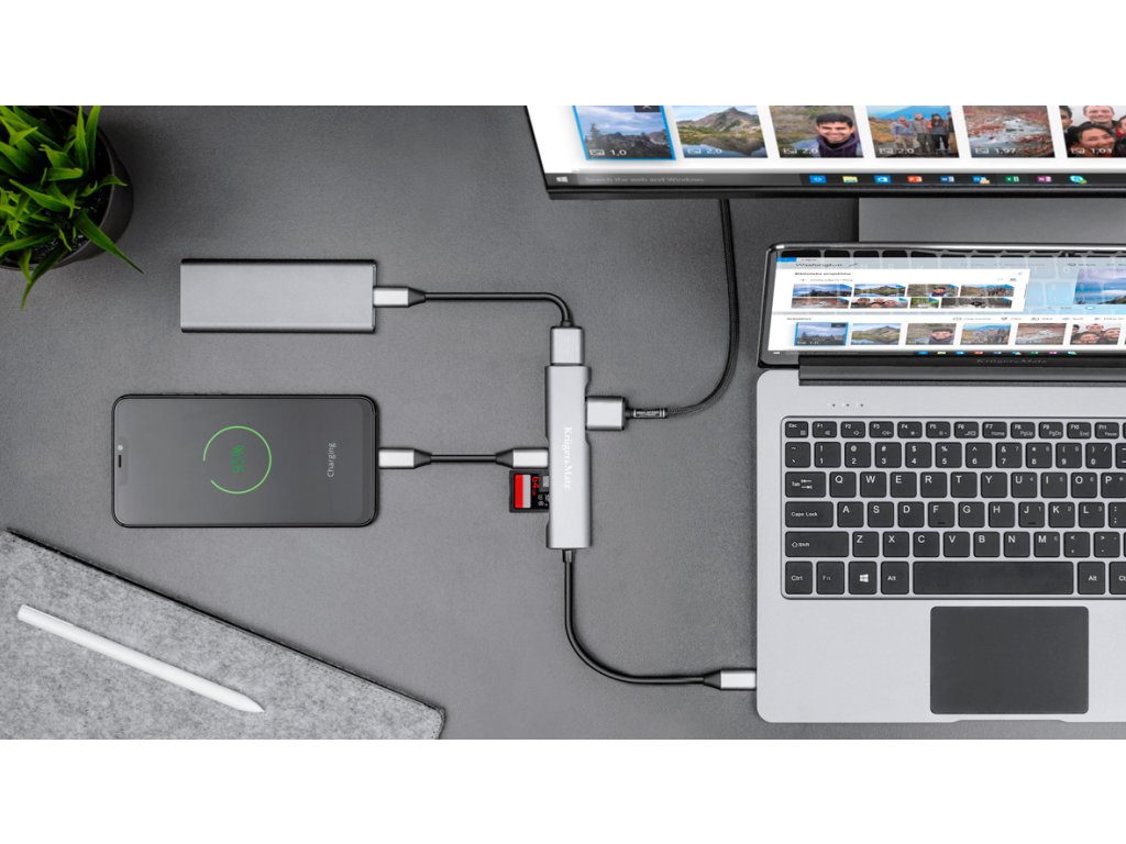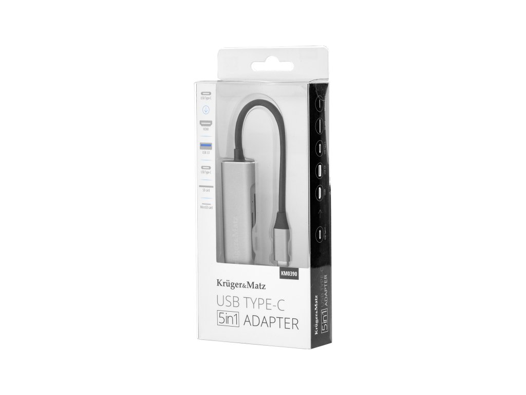 Doriți să extindeți posibilitățile ultrabook-ului sau tabletei dumneavoastră Nu trebuie să cumpărați mai mulți adaptatori diferiți! Acum aveți nevoie doar de un singur dispozitiv - un adaptor 5 în 1 de la compania Kruger&Matz. Tot ce aveți nevoie este un port USB de tip C pentru dispozitivul dumneavoastră mobil și puteți să-i măriți funcționalitatea de cinci ori! Adaptorul este echipat cu un conector USB 3.0, adică un port USB standard cu o capacitate de transfer crescută, care, printre altele, permite transferul de date la o viteză mult mai mare - chiar și 5 Gb/s și conectarea de dispozitive, cum ar fi un mouse sau o tastatură. Un alt port extrem de util este ieșirea HDMI cu suport pentru rezoluția 4K. Conectați computerul la un alt monitor sau televizor și bucurați-vă de imagine la cea mai înaltă calitate.Adaptorul este de asemenea echipat cu două cititoare ce suportă carduri de memorie cu capacitate de 2 TB. Conectorul pentru card SD vă permite să transferați fotografiile de pe un aparat de fotografiat digital sau înregistrările de pe un video recorder auto. În plus, hub-ul este echipat cu un cititor de carduri micro SD, care vă permite să copiați rapid și convenabil muzică pe un card de memorie fără a avea nevoie de cabluri. Un mare avantaj al adaptorului Kruger&Matz este portul USB de tip C, care utilizează tehnologia Power Delivery. Acesta permite nu numai încărcarea rapidă a telefoanelor, ci și alimentarea laptopurilor și monitoarelor.