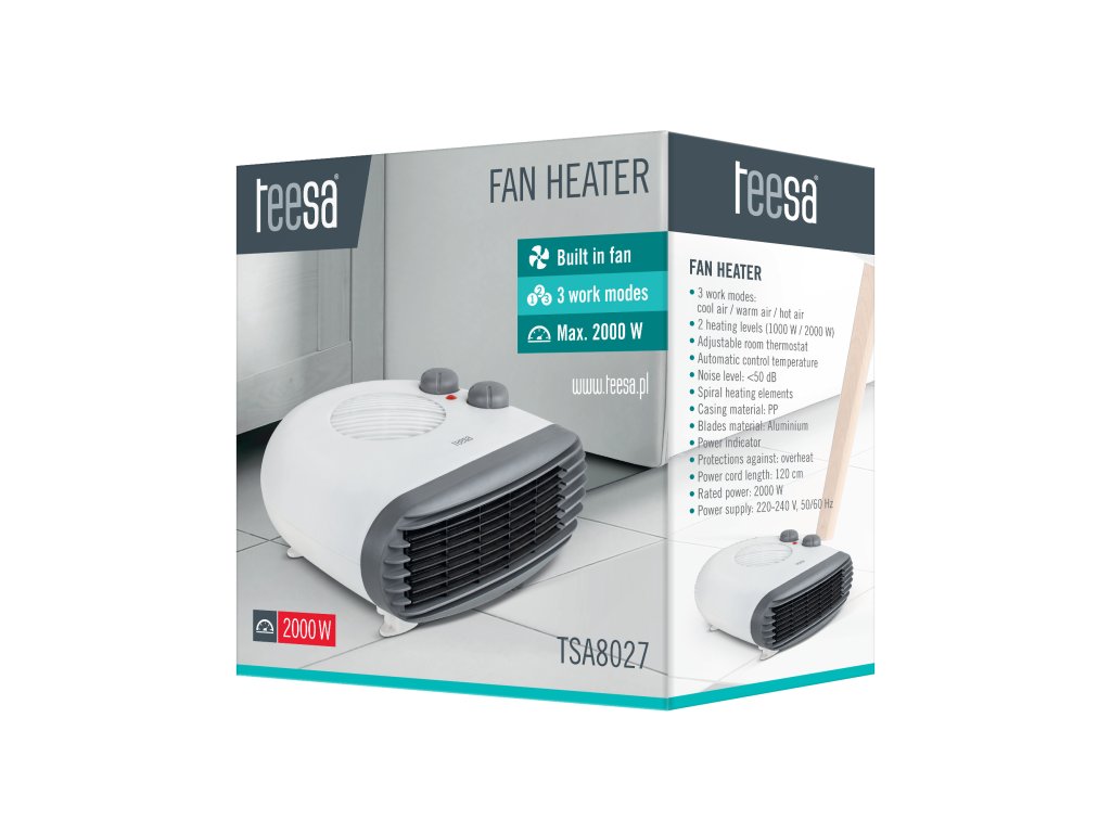 Termoventilatorul Teesa TSA8027 este un aparat indispensabil în orice gospodărie. Datorită celor trei moduri de funcționare - cu aer rece, cald sau fierbinte - este potrivit atât pentru zilele reci, cât și pentru cele fierbinți, fiind astfel mereu la îndemână indiferent de anotimp. Încălzitorul cu ventilator TSA8027 este fabricat din aluminiu de înaltă calitate și dispune de două trepte de putere de încălzire: 1.000 W și 2.000 W, precum și de un termostat reglabil și de o reglare automată a temperaturii, astfel încât să puteți seta condițiile din cameră conform nevoilor dumneavoastră. Un avantaj al unității este funcționarea silențioasă, astfel că puteți urmări televizorul, asculta muzică sau vorbi la telefon, în timp ce termostatul se ocupă de căldura din cameră.