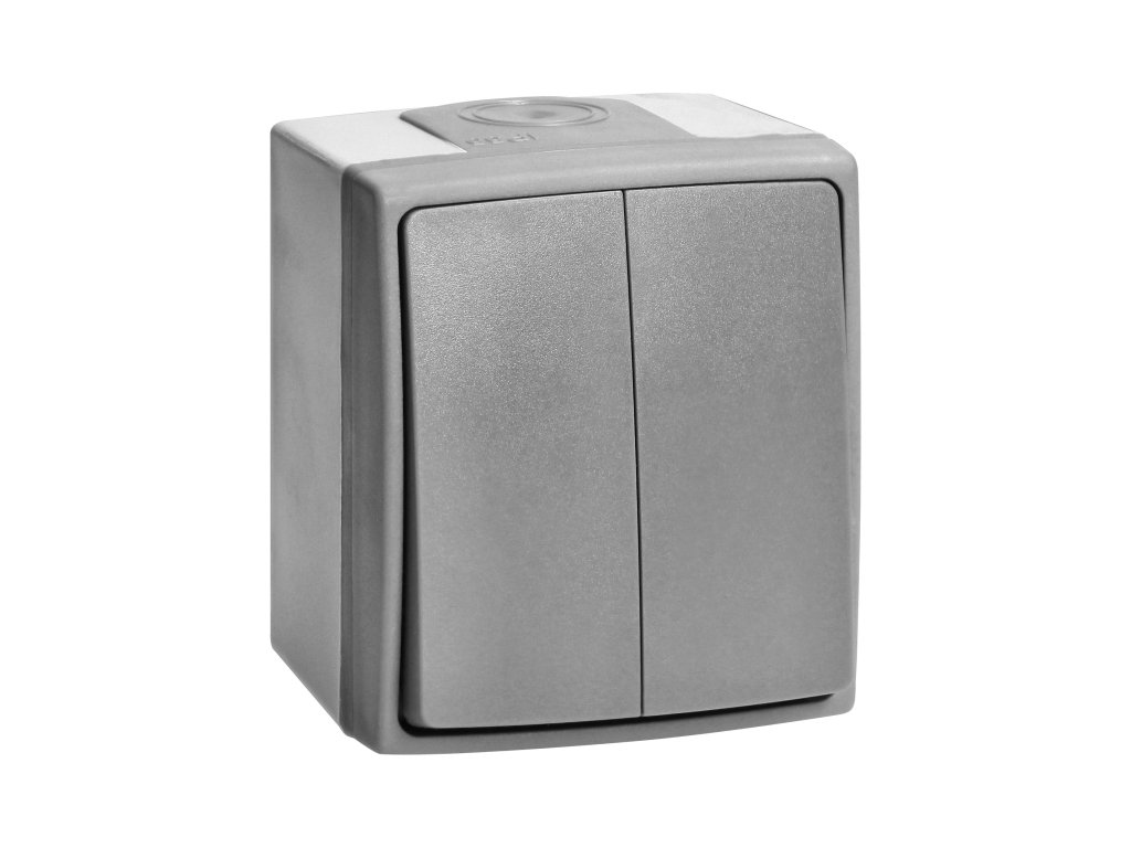 AQUATIC PRO IP55 Întrerupător cu două butoane, este un comutator de suprafață echipat cu două butoane destinat controlului a două (sau mai multe) circuite, servind de exemplu la conectarea candelabrelor în instalația electrică.