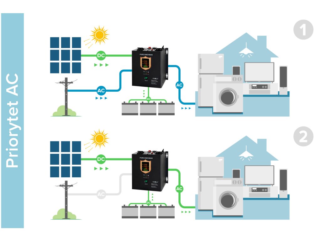 Mod de operare: PV (prioritate PV / fotovoltaică) /AC (prioritate AC / rețea)