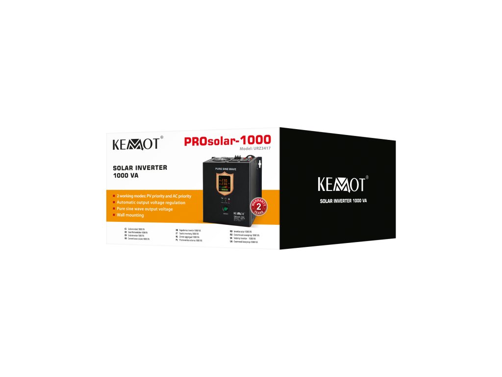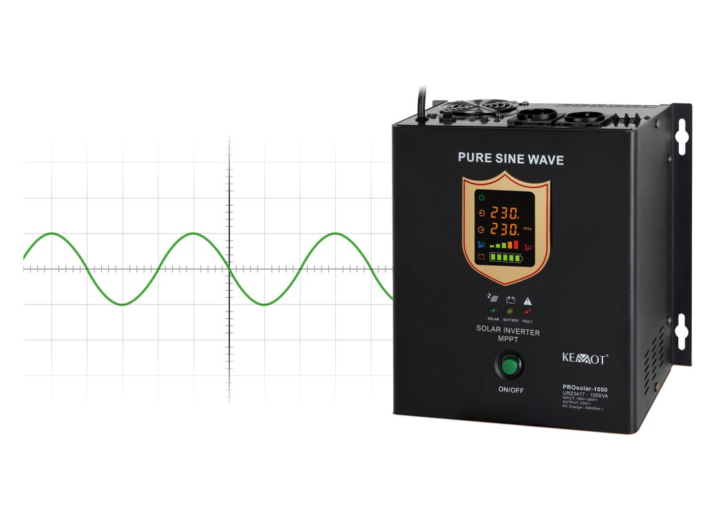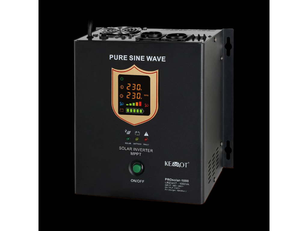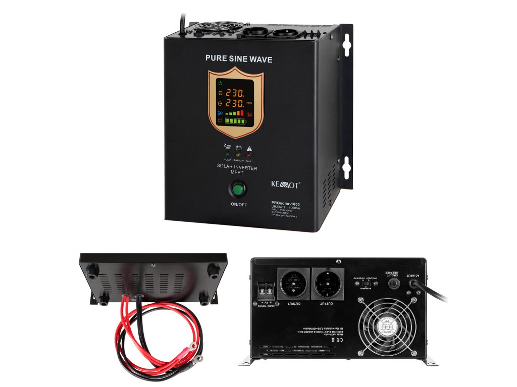 Inverterul solar KEMOT PROsolar-700 cu puterea nominală de 700 W permite lucrul cu module fotovoltaice și rețeaua electrică datorită funcționalității sale extinse. Datorită intrării directe în panourile solare, dispozitivul utilizează energia solară pentru a alimenta echipamentele. Dispozitivul este potrivit pentru alimentarea echipamentelor electrice care necesită tensiune alternativă de 230 V și, ca sursă de urgență, asigură funcționarea fără defecte a echipamentelor care necesită alimentare continuă, de exemplu, pompe de încălzire centrală, sisteme de alarmă și supraveghere. Convertorul KEMOT PROsolar-700 are o carcasă robustă echipată cu un suport care permite agățarea pe perete, de exemplu, în camera centralei sau în tabloul electric.