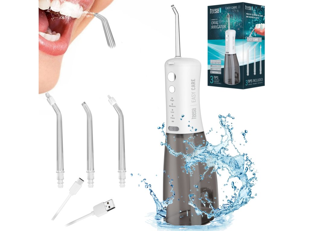 Irigator dentar wireless Teesa Easy Care Nici cea mai perfectă periuță de dinți nu va îndepărta toate resturile de alimente, bacterii și tartru. Dacă doriți să aveți mai multă grijă de igiena cavității bucale, încercați irigatorul Teesa Easy Care 2. Utilizarea lui zilnică va reduce riscul apariției cariilor dentare și a altor boli ale dinților și gingiilor. Aveți grijă de un zâmbet sănătos și frumos în fiecare zi, limitând vizitele la dentist. Irigator wireless Un irigator Teesa Easy Care 2 complet încărcat garantează o funcționare continuă de aproximativ 45 de minute. Acesta se traduce în multe zile de utilizare fără necesitatea reîncărcărilor frecvente. Este, așadar, un dispozitiv ideal pentru utilizarea zilnică acasă și în călătorii.