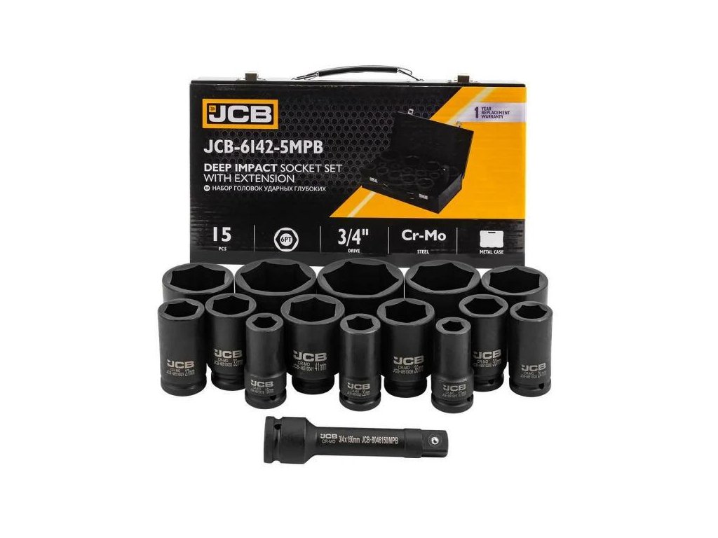 JCB Set de capete pentru impact adânci 3/4" Cr-Mo hexagonale 14 Piese