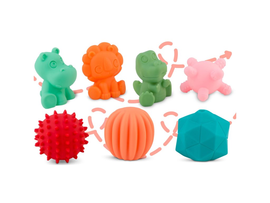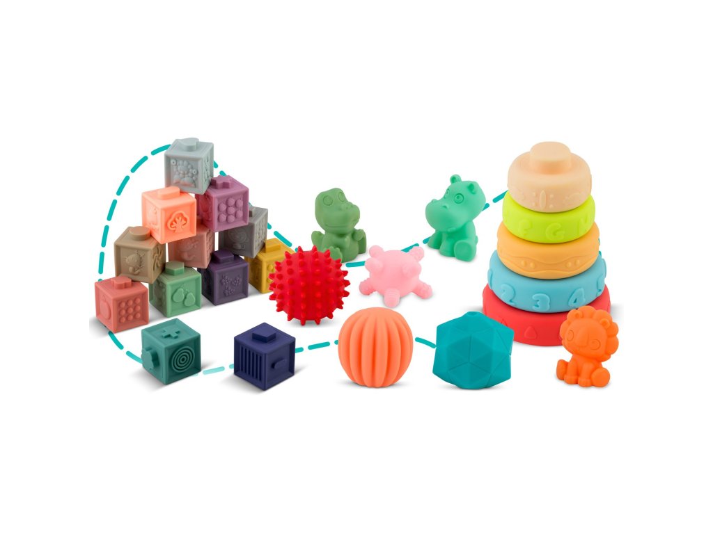 , conținând numeroase elemente cuprotuberanțe și forme diverse. Unele dintre jucării pițigăie la apăsare!
