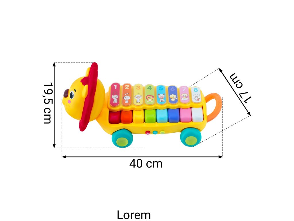 Produsul este ideal pentru învățarea numelor animalelor și culorilor . Are panou muzical și clape luminoase.