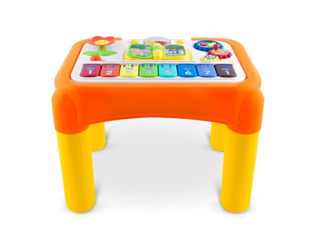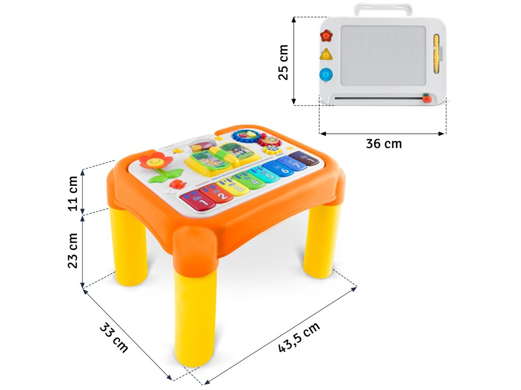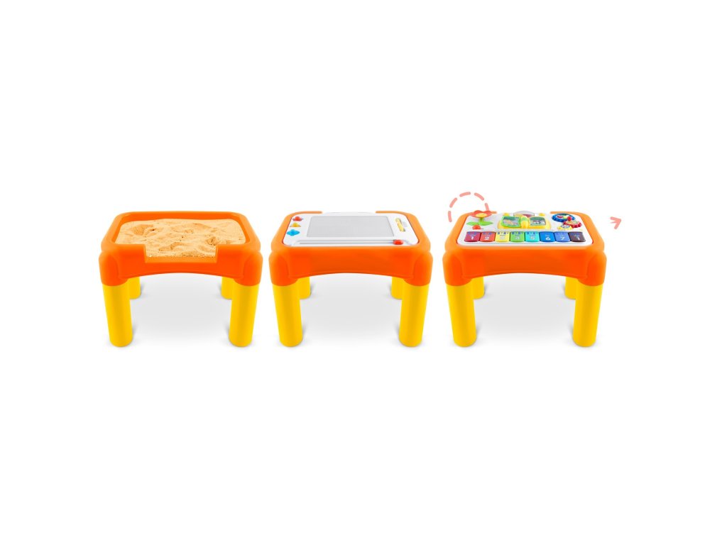 Masa, pe lângă funcția de masă și tablă educațională, servește excelent și ca cutie cu nisip!