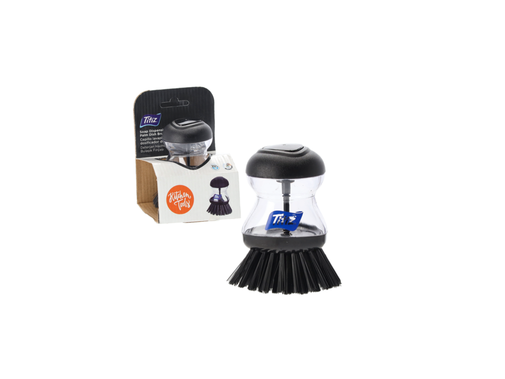 Perie pentru vase cu dozator este un instrument de bucătărie foarte funcțional. Mânerul bine conturat asigură o utilizare confortabilă. Are un recipient demontabil pentru turnarea fluidelor și un buton special pentru dozare.-dimensiuni: 80 x 100 mm