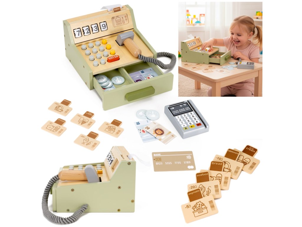 - Casa de marcat are butoane care fac clic și role rotative, permițând copilului să „înregistreze achiziții.” Cititorul de carduri din lemn arată realist, cu butoane frumos pictate, dar nu funcționează ca un cititor real.