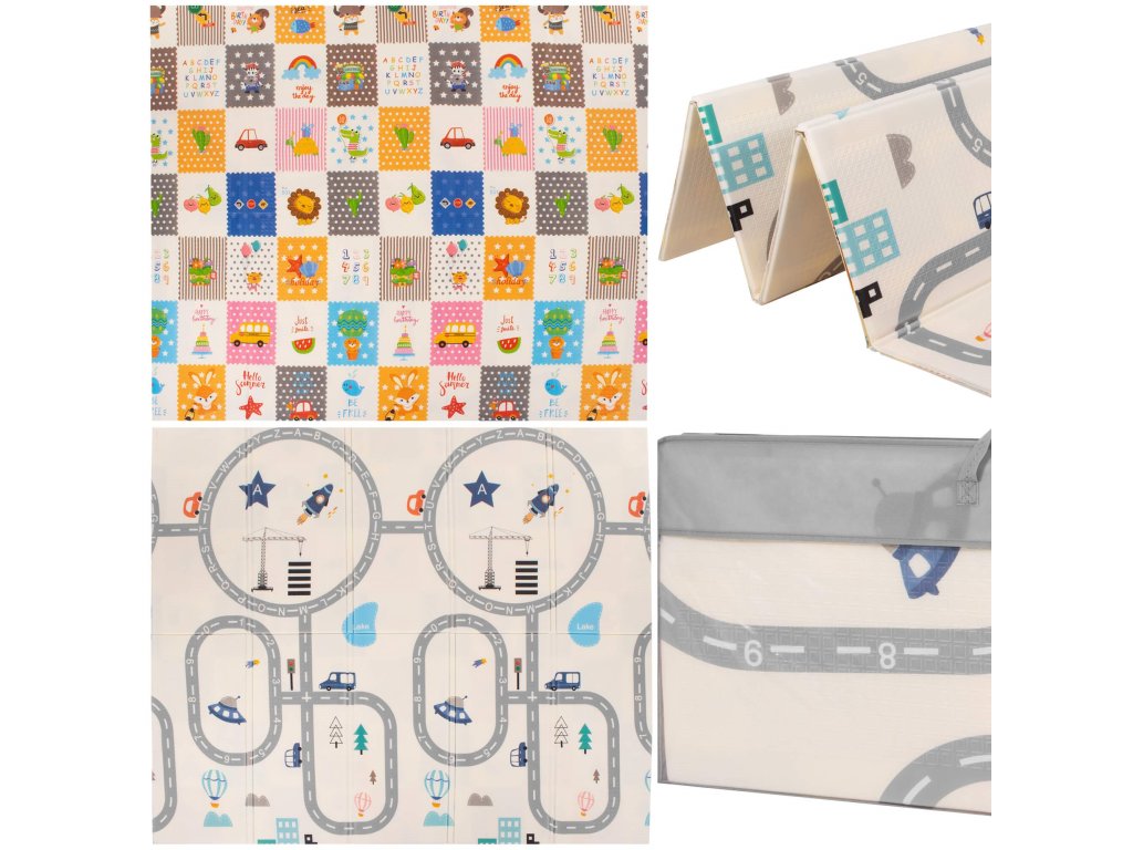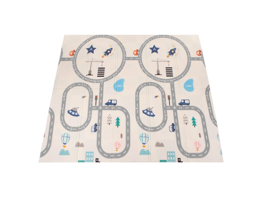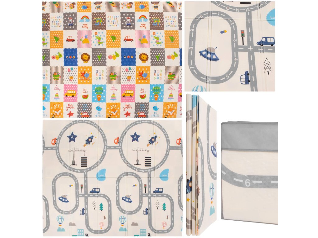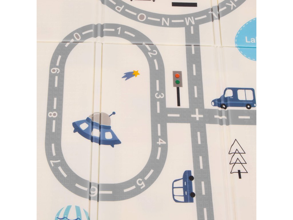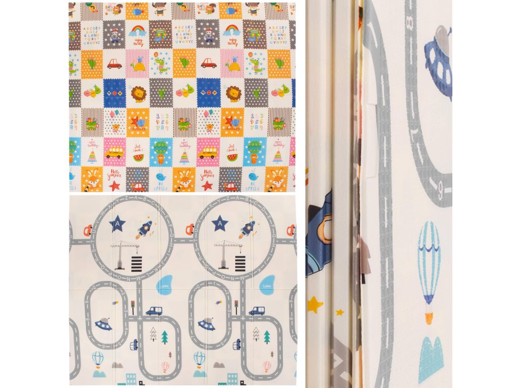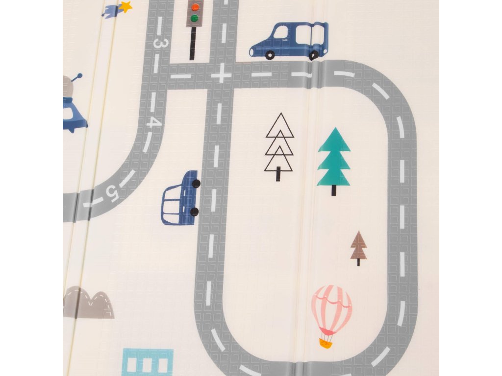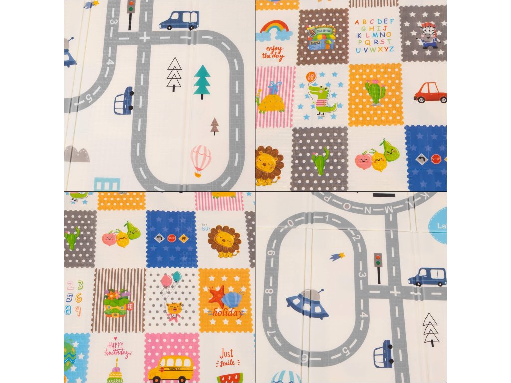 - Saltea cu două fețe. Pe o parte, model cu străzi și vehicule pe fundal ecru. Pe cealaltă parte, model cu imagini vesele multicolore, litere și cifre.