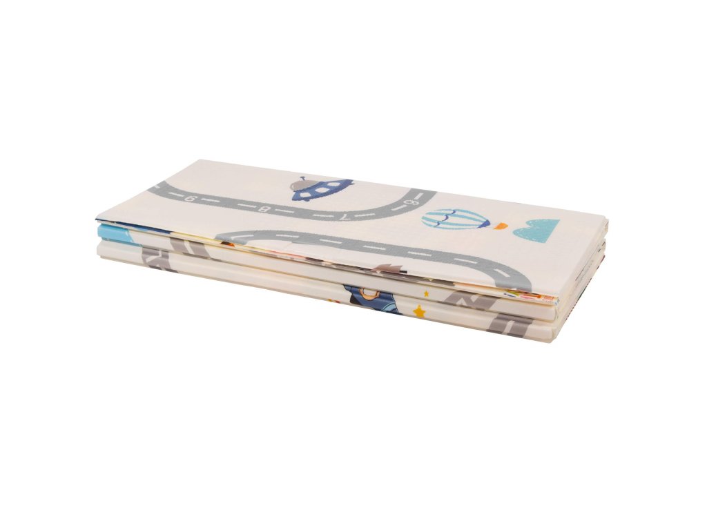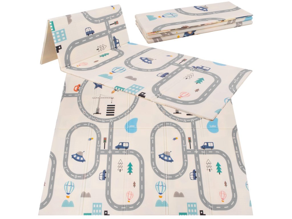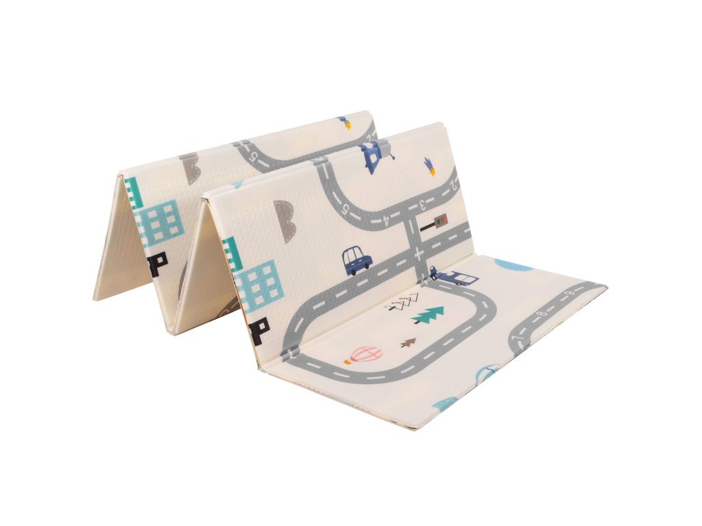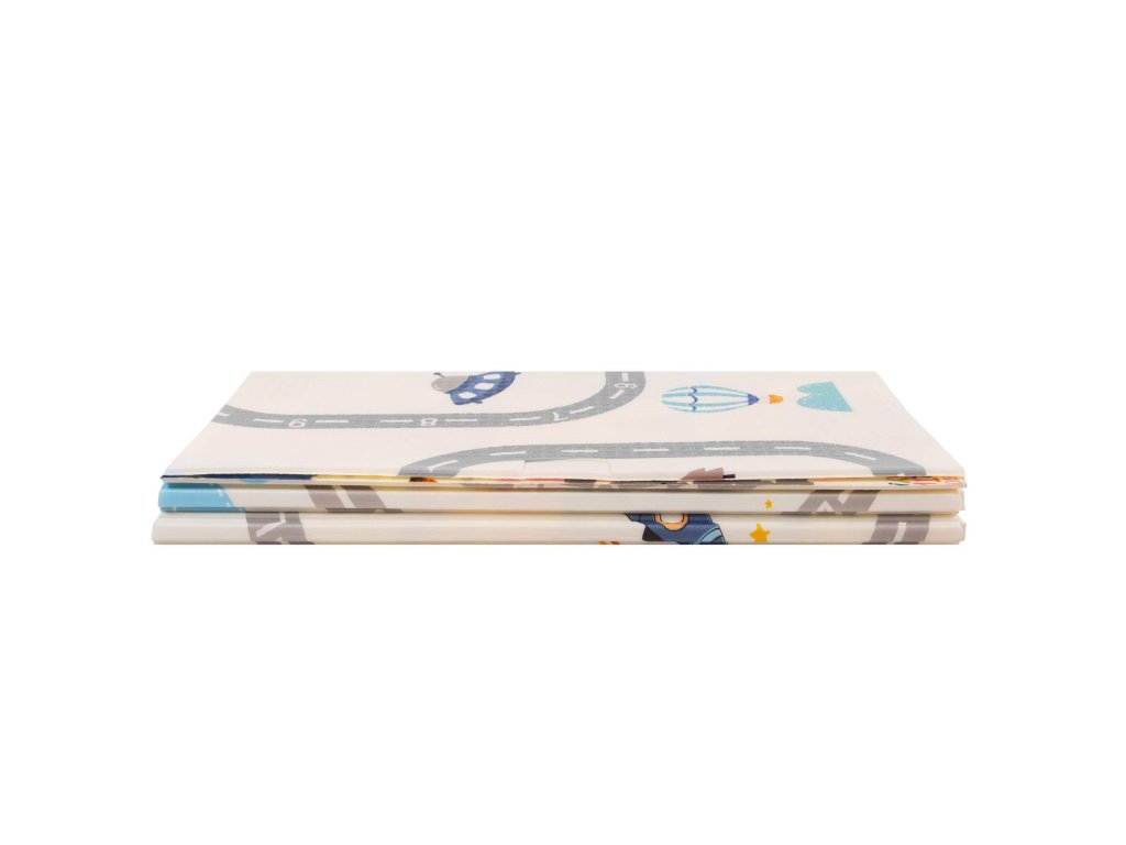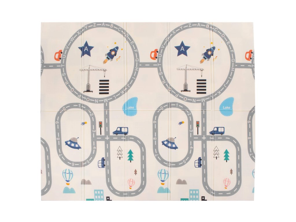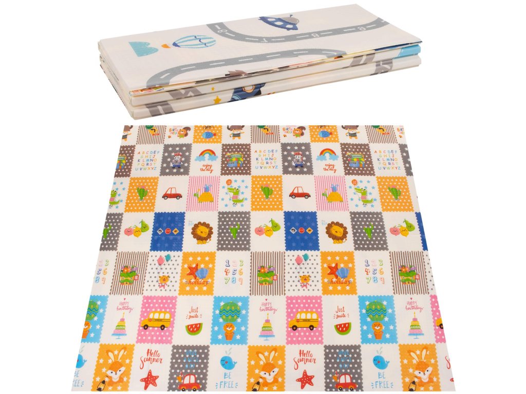 - Saltea cu două fețe. Pe o parte, model cu străzi și vehicule pe fundal ecru. Pe cealaltă parte, model cu imagini vesele multicolore, litere și cifre.