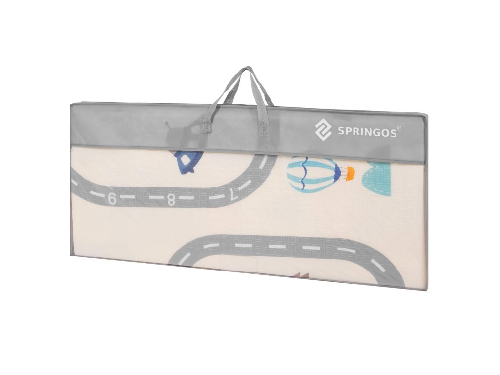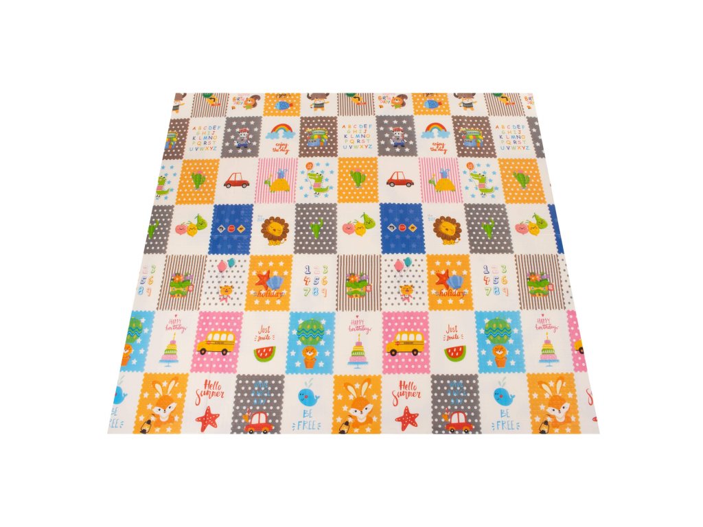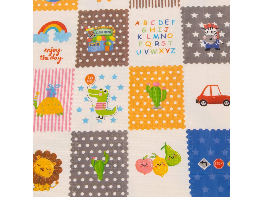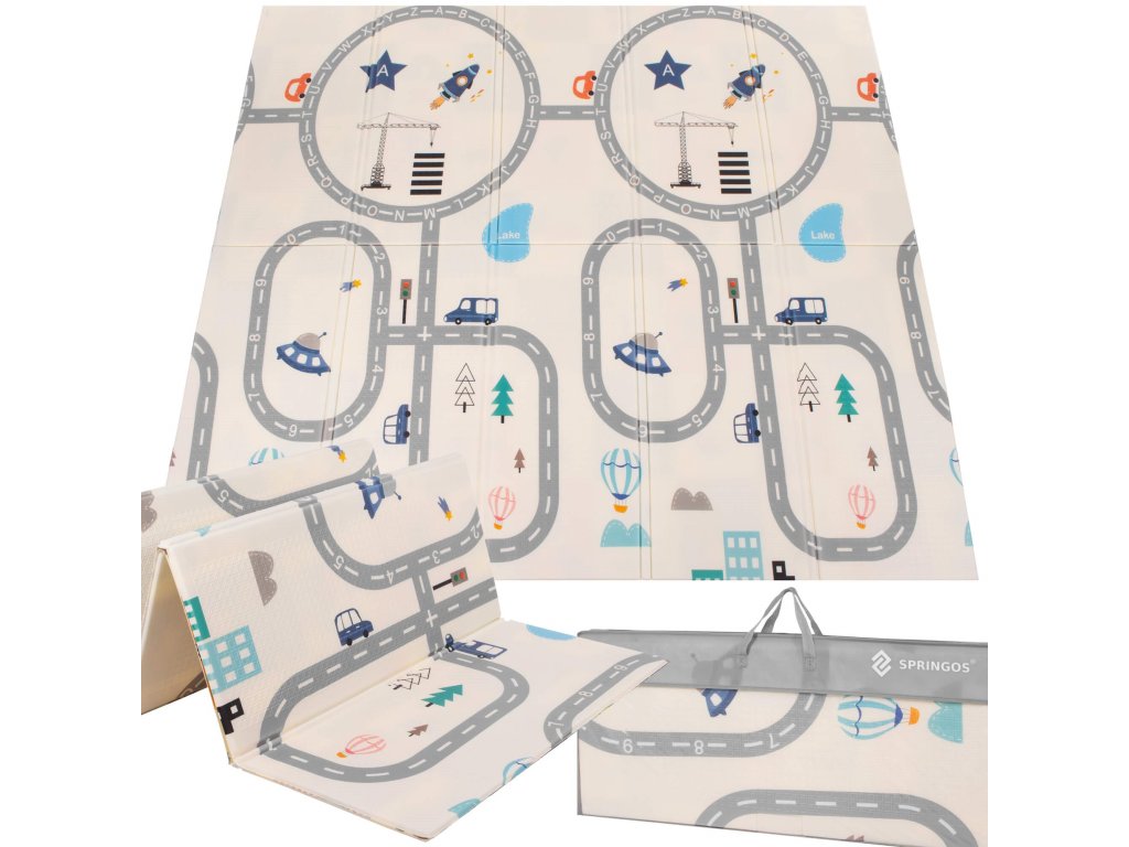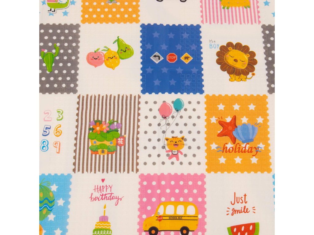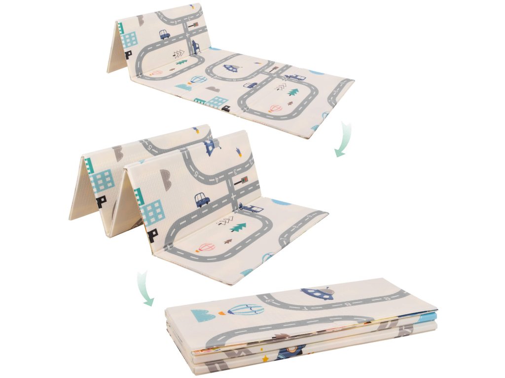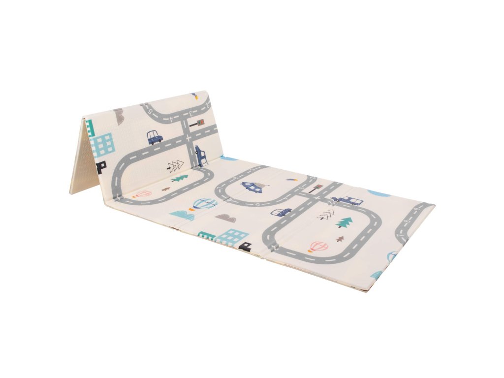 - Saltea cu două fețe. Pe o parte, model cu străzi și vehicule pe fundal ecru. Pe cealaltă parte, model cu imagini vesele multicolore, litere și cifre.