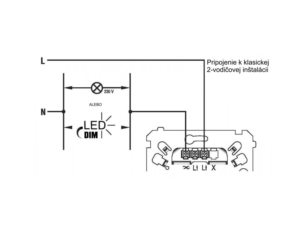 Variator rotativ cu buton pentru LED-uri cu funcție de reglare a intensității luminoase (modul) 230V alb.Conexiune clasică cu două fire sau conexiune cu trei fire în combinație cu un comutator de scară (încrucișat). (fără necesitatea conectării conductorului neutru N)