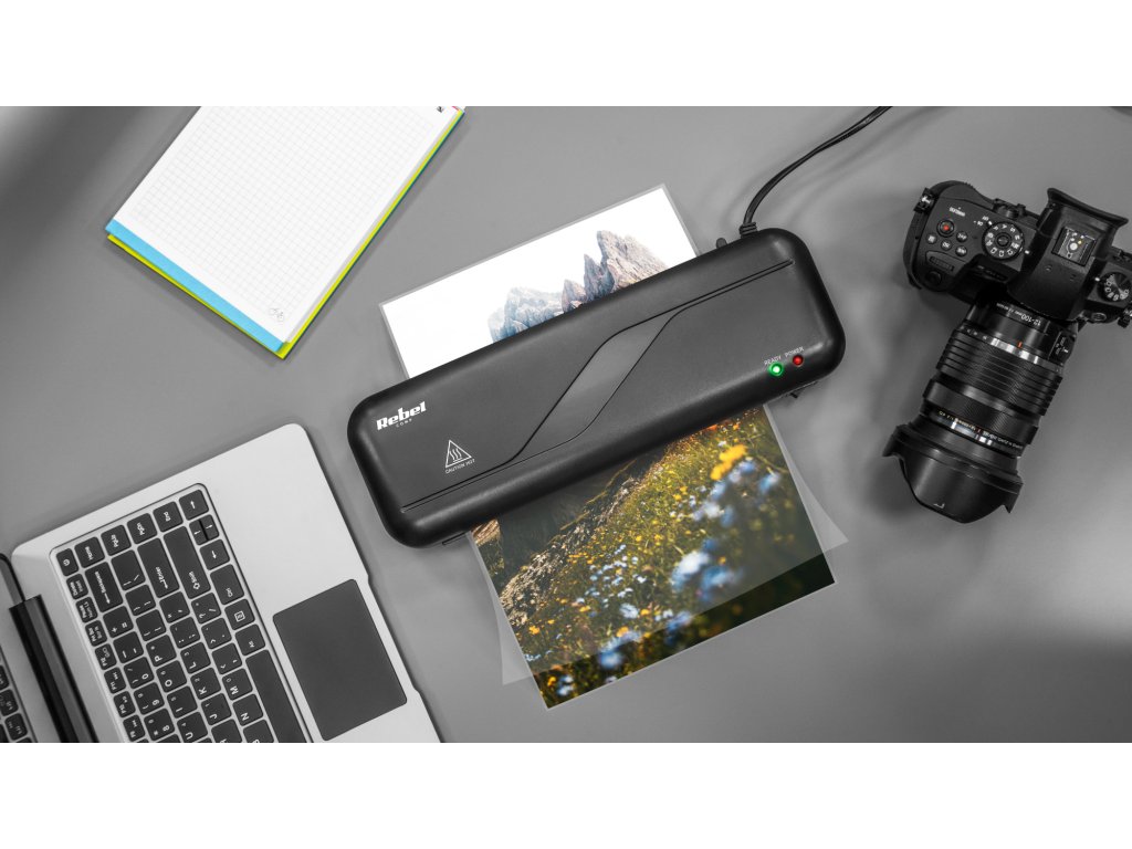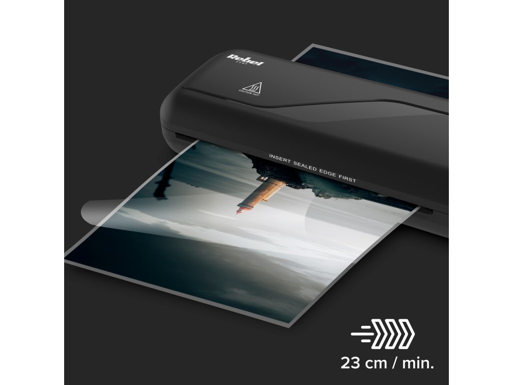 Dispozitivul de laminare Rebel funcționează în modul de laminare la cald. Aceasta înseamnă că în timpul acestui proces folia este încălzită și apoi atașată la suprafață, oferind durabilitate și rezistență la deteriorarea documentelor dumneavoastră.