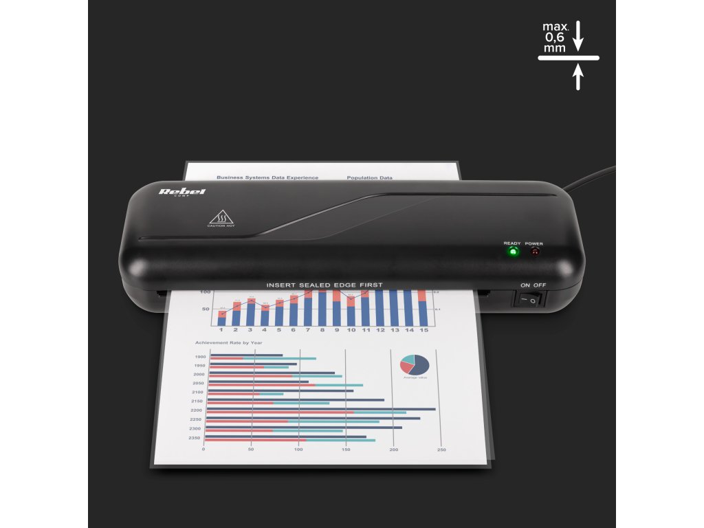 Laminatorul de hârtie Rebel permite protejarea documentelor cu o grosime maximă de 0,6 mm. Astfel, puteți lamina atât foi subțiri, cât și pe cele cu o grosime puțin mai mare.