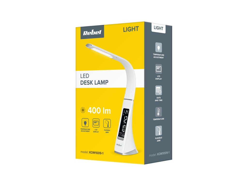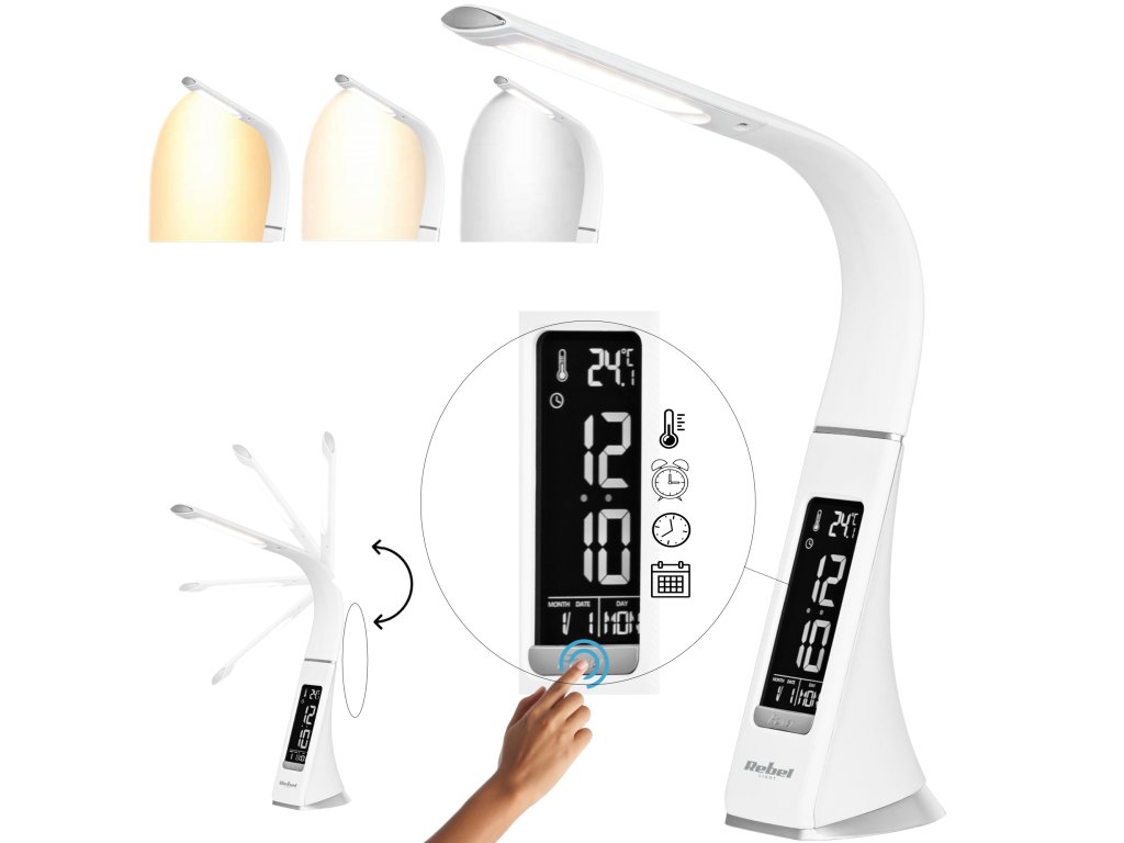 Îți plac dispozitivele simple și funcționale Dacă da, cu siguranță îți va plăcea lampa de birou LED cu afișaj de la Rebel. Datorită afișajului menționat mai sus, cu care este echipat dispozitivul, vei ști ora curentă, data, ziua săptămânii și temperatura și îți vei putea seta alarma și amâna trezirea - aceasta este soluția ideală pentru persoanele care apreciază soluțiile practice. Este important că, deși această lampă de birou este alimentată de la rețea, chiar și în caz de pană de curent poți menține setarea orei și funcționarea alarmei cu ajutorul bateriei.