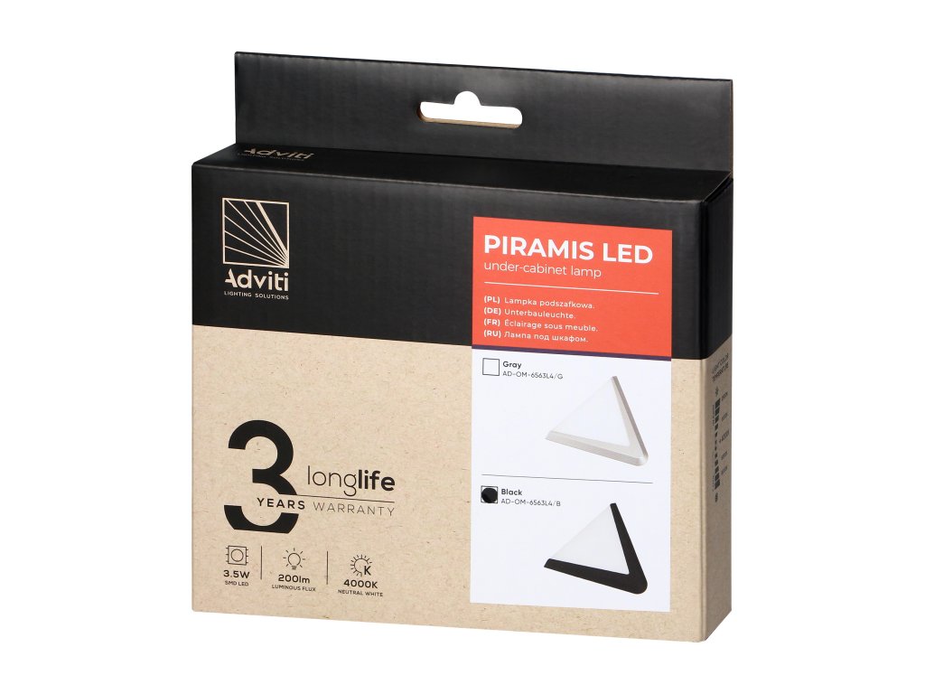 Lampa PIRAMIS LED are un design modern și minimalist. Forma sa plată, triunghiulară, iese ușor în afara suprafeței dulapului și este aproape imperceptibilă. Fiind disponibilă în două variante de culoare (gri și negru), lampa poate fi ajustată la diferite tipuri de interioare. Este realizată din plastic durabil cu un finisaj mat satinat.