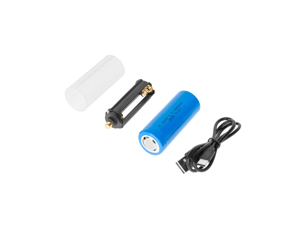 În pachet: cablu USB-C (45 cm), 1 baterie 26650, adaptor pentru baterie 18650, adaptor pentru baterii AAA