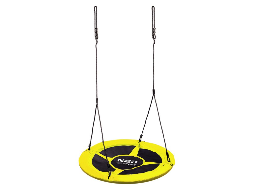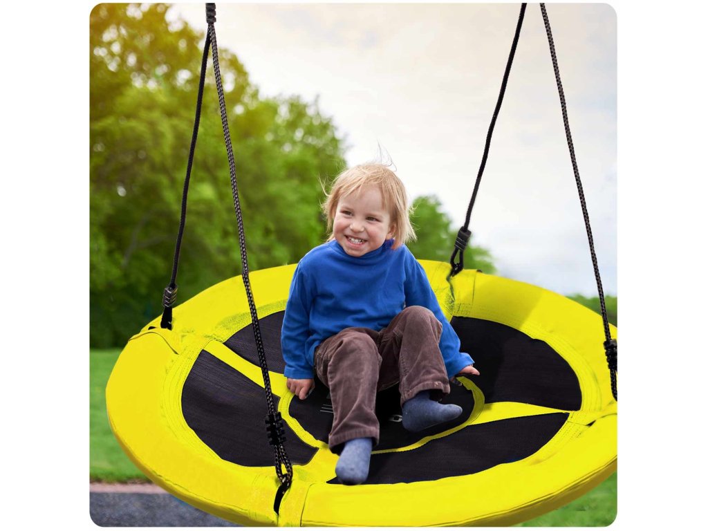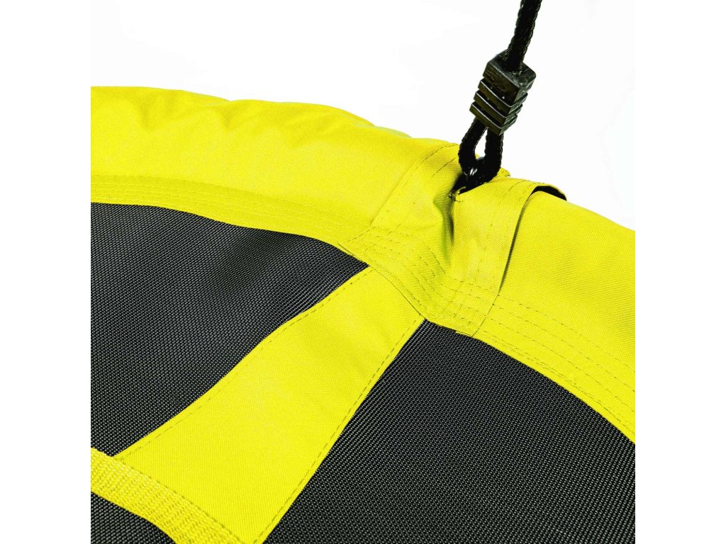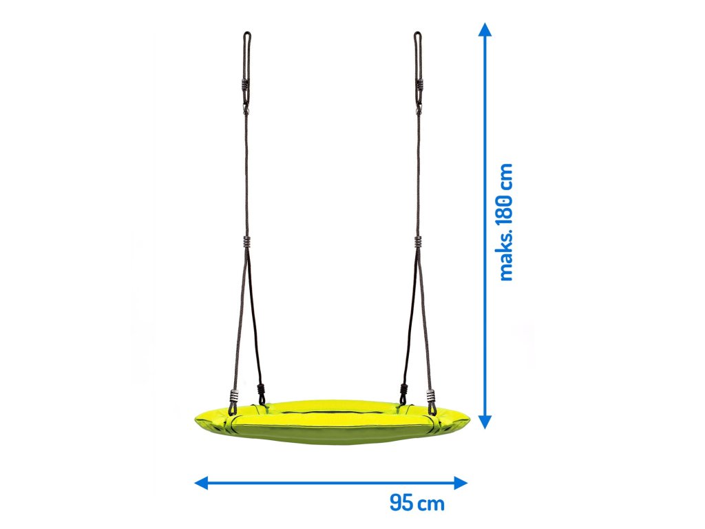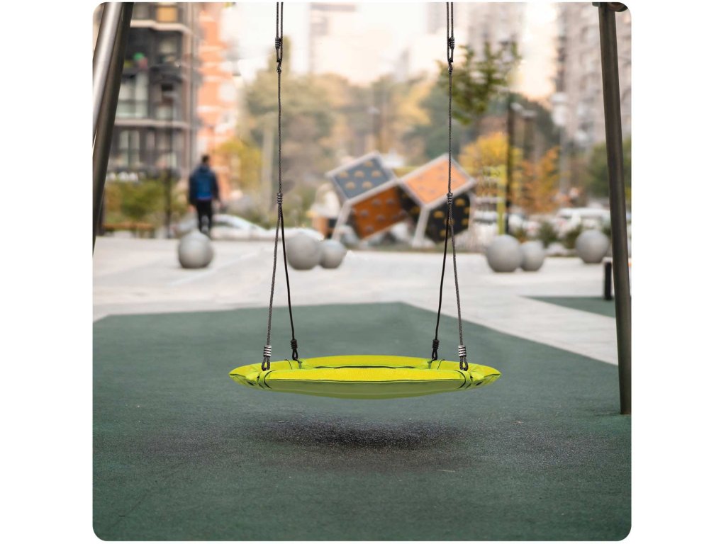 Leagăn pe cadru de oțel acoperit cu spumă de protecție moale, realizat din material durabil cu multiple cusături și pe frânghii suspendate groase. Asigură siguranță, stabilitate și durabilitate.