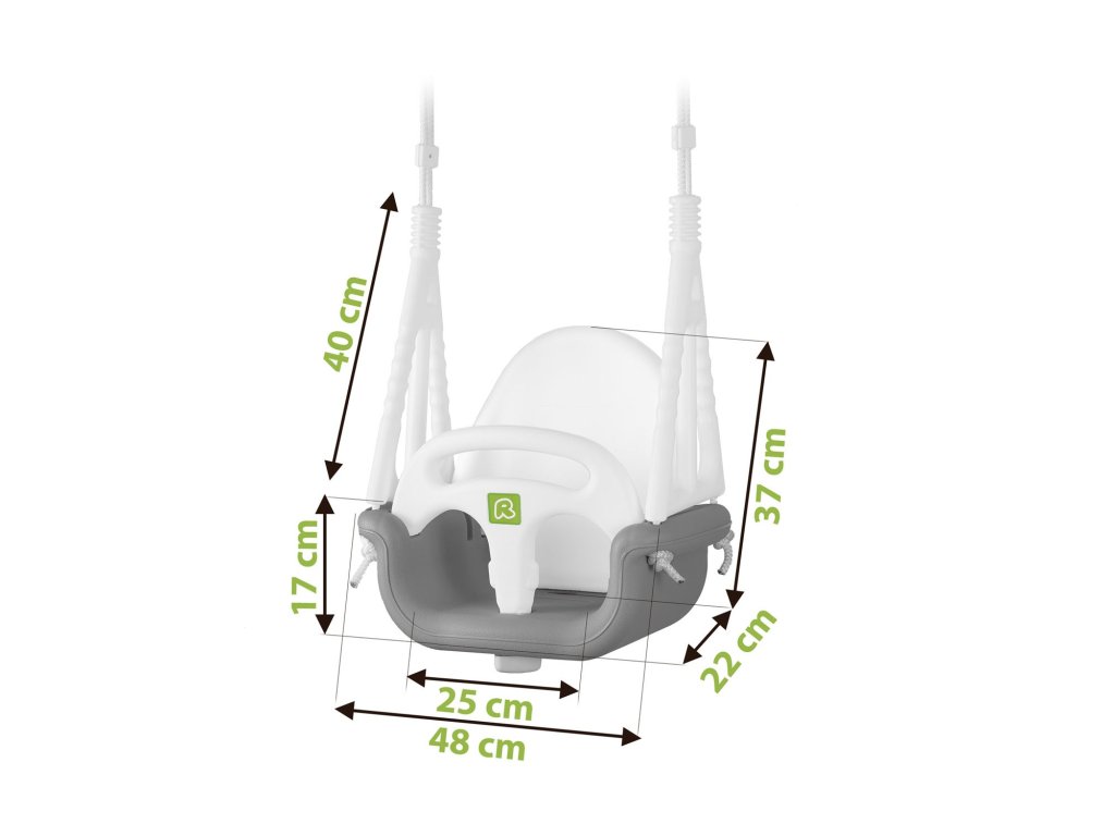 - Frânghii rezistente cu o lungime de până la 130 cm care pot fi ajustate cu ajutorul unor cleme metalice, frânghiile sunt protejate suplimentar cu plastic special care protejează mâinile copiilor de posibile abraziuni și sporesc stabilitatea la balansare.