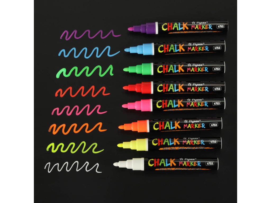Acest set de8 markere cu cretă este alegerea ideală pentru a crea desene, inscripții și decorațiuni pe diverse suprafețe netede - table, sticlă, oglinzi, pahare sau obiecte din plastic. Ideal pentru utilizare acasă, cât și profesională, de exemplu, în cafenele, restaurante sau școli.