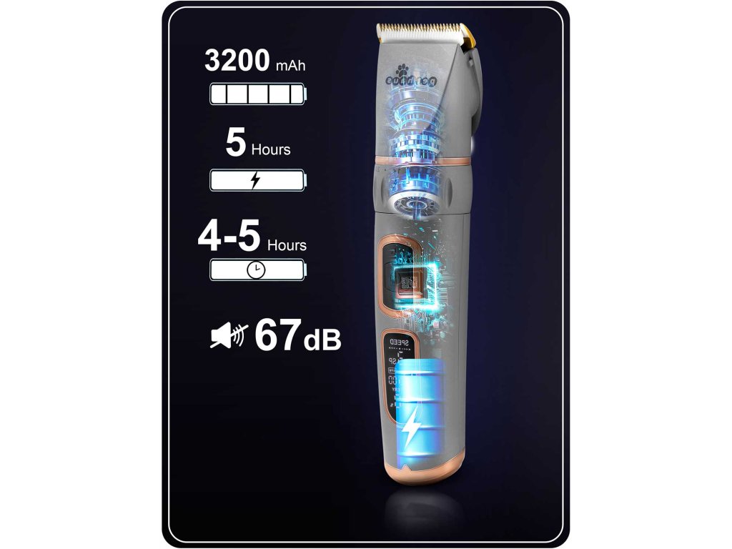 Aparatul este echipat cu un motor puternic și foarte silențios, care minimizează stresul la animale. Funcționarea silențioasă a aparatului face ca și animalele sensibile să se simtă mai în siguranță în timpul tăierii.