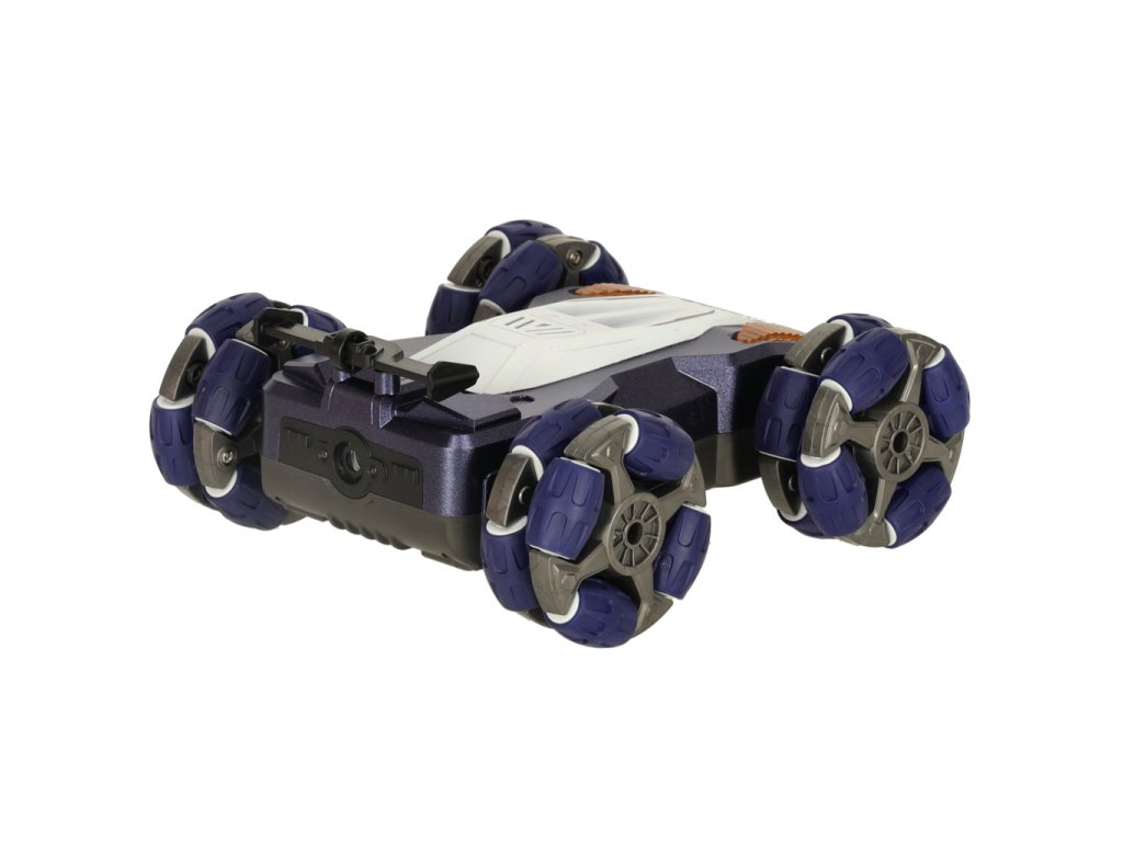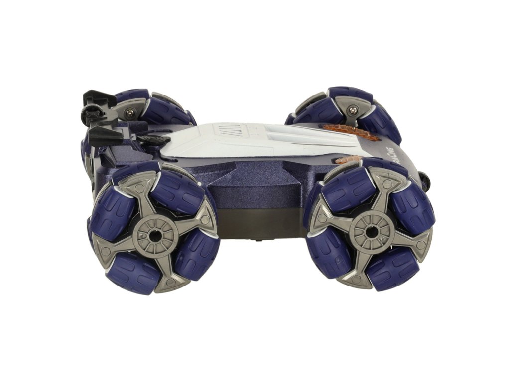 Mașinuța se mișcă în patru direcții, ceea ce îi permite să facă față celor mai dificile drumuri. Roțile duble nu numai că oferă vehiculului un aspect modern și elegant, dar oferă și aderență excelentă pe diverse suprafețe. Luminile și eșapamentul cu efect de fum (abur) fac distracția și mai captivantă.