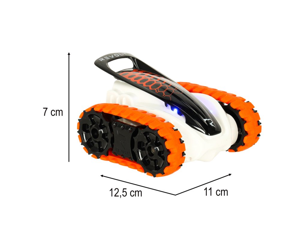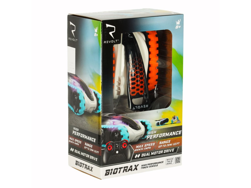 REVOLT BIOTRAX nu este un vehicul telecomandat obișnuit, ci o mașină de teren futuristă în miniatură! Datorită construcției robuste și șasiului pe șenile, face față mașina oricăror condiții. Fie că este vorba de o cameră acoperită cu covor sau de o curte plină de iarbă, REVOLT BIOTRAX trece pe orice suprafață!