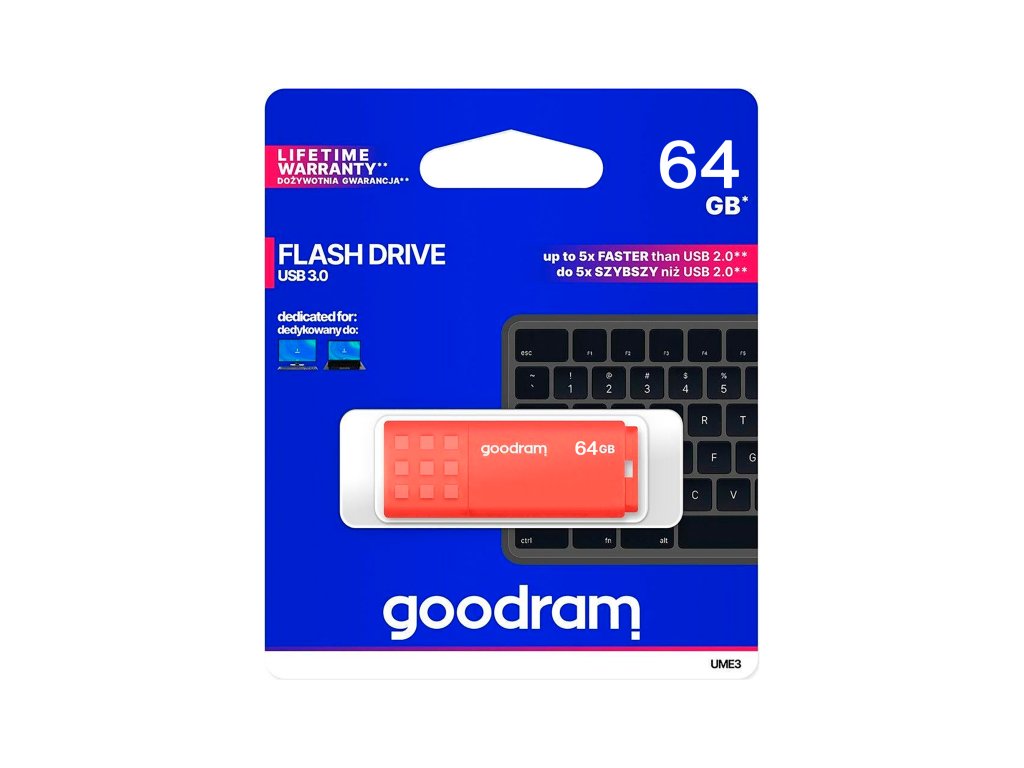 UME3 are un design clasic, care este accentuat de intensitatea culorilor carcasei. Capac-ul cu model antiderapant reliefat facilitează deschiderea USB-ului în orice situație. După scoaterea capacului, îl puteți plasa la celălalt capăt al carcasei, pentru a vă asigura că nu se pierde. Ideal pentru cei care doresc să aibă întotdeauna la îndemână stick-ul USB, deoarece este echipat cu o perforație pentru atașarea unui breloc. Stick-ul de memorie UME3 este disponibil cu capacități de la 16 GB la 128 GB. Componentele utilizate permit o viteză de citire de până la 60 MB/s și o viteză de scriere de până la 20 MB/s. La fel ca toate celelalte stick-uri USB GOODRAM, UME3 beneficiază de o garanție pe viață a producătorului.