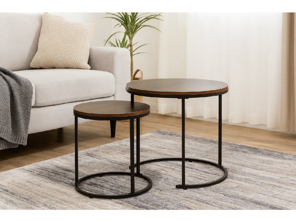 Set de două mese de cafea circulare cu blatul din imitație de lemn și cadru metalic negru este o soluție stilată și funcțională pentru orice interior. Dimensiunile diferite permit o aranjare variată, ## creând astfel ## un set elegant și practic.