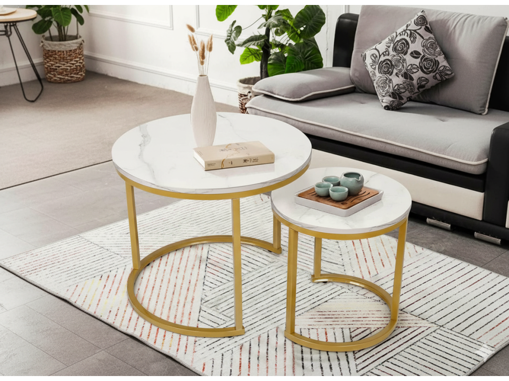 Setul de două mese de cafea rotunde stilate este o combinație de design modern cu eleganța clasică a marmurei. Blatul alb delicat cu un model subtil care imită marmura, împreună cu baza metalică aurie creează un întreg extrem de rafinat. Se potrivește perfect în living, dormitor sau birou – atât în stil glamour, cât și minimalist.