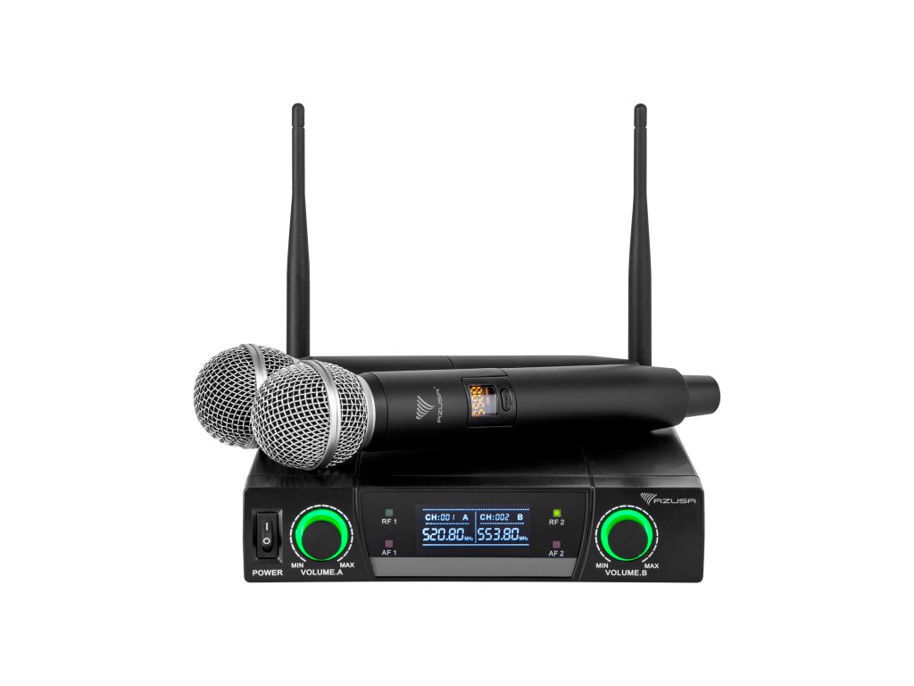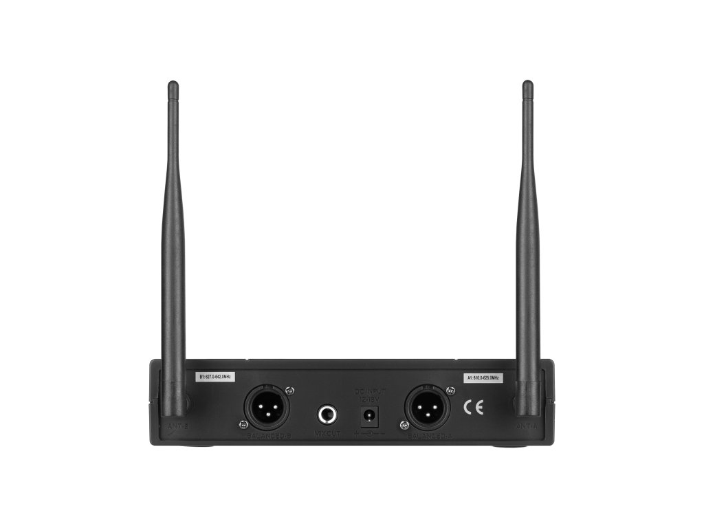 În pachet: receptor, 2x microfon de mână, adaptor de rețea, cablu de 6,3 mm,