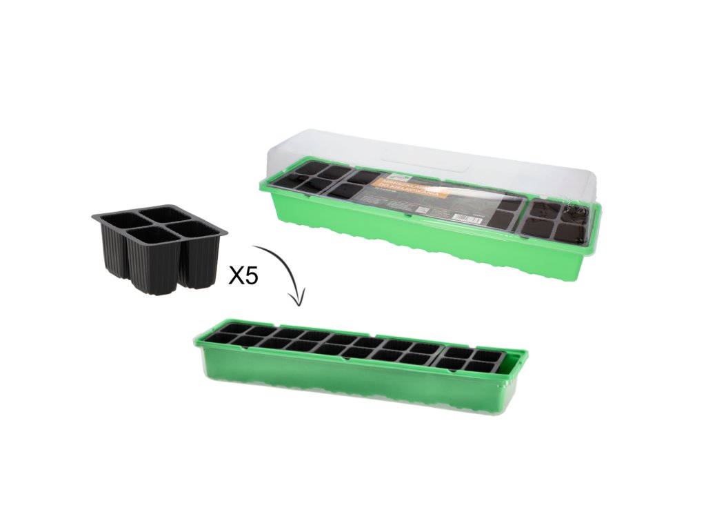 Mini seră asigură condiții ideale pentru germinarea semințelor. Capacitatea transparentă permite o control constant al semănăturii și garantează accesul la lumină.Seră are 20 (5x4) celule detașabile pentru semănat. Fiecare celulă are două orificii de drenaj pentru scurgerea apei.