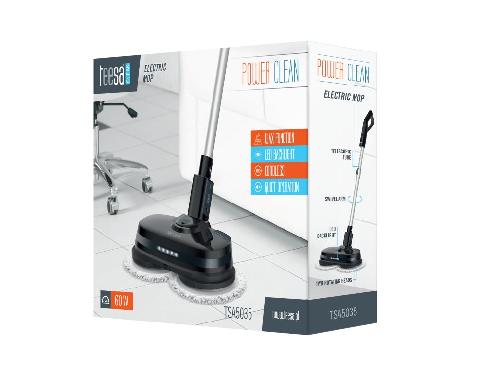 Vrei să scapi de curățarea podelelor, o activitate consumatoare de timp și obositoare Avem soluția pentru tine - mopul electric Teesa POWER CLEAN! Datorită performanței sale ridicate și capacității mari a bateriei, curățarea tuturor murdăriilor de pe podelele casei tale va fi absolut fără efort. Nu trebuie să te mai apleci sau să ții furtunul umed în mână niciodată - lasă mopul nostru electric să se ocupe de podelele tale!