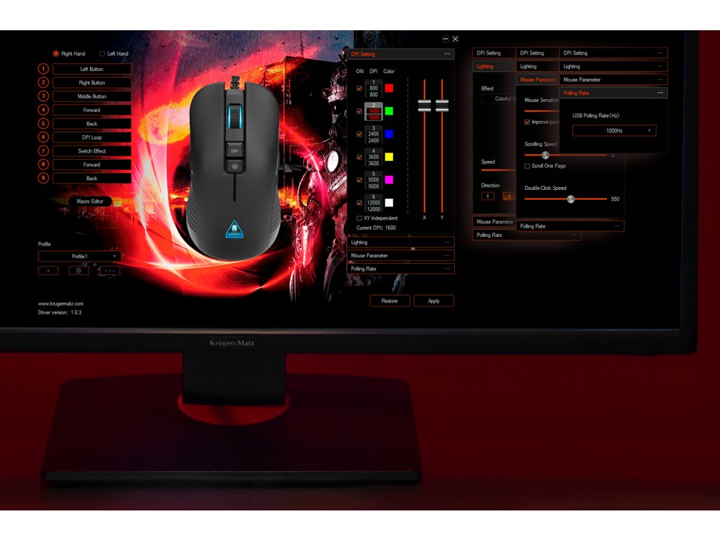 Toate setările mouse-ului Kruger&Matz Warrior GM-60 pot fi modificate confortabil cu ajutorul unei aplicații specializate. Acum poți gestiona profilurile, schimba parametrii și atribui funcții, și, dacă este nevoie, restaura setările de fabrică cu un singur buton.