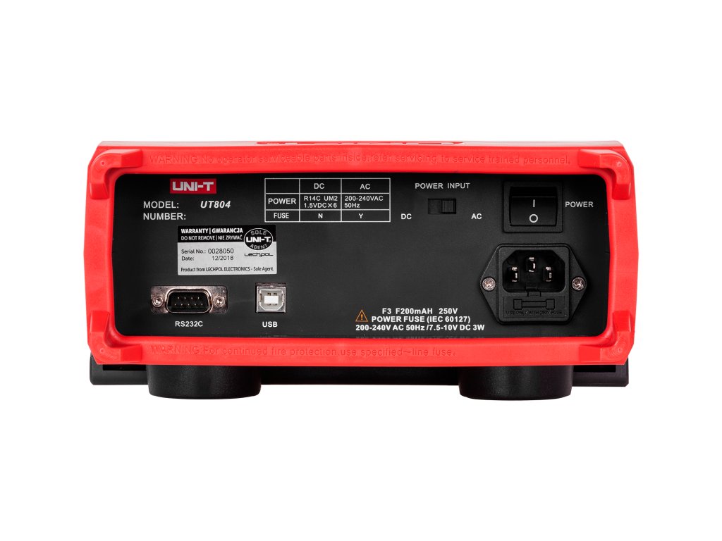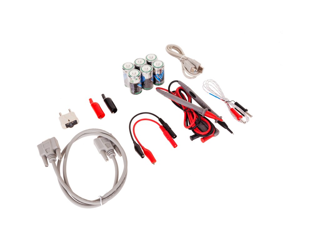 Accesorii: Fire de testare, sondă de măsurare a temperaturii, clești de crocodil, fire de testare scurte cu clești de crocodil, soclu de măsurare a condensatoarelor, cablu USB, cablu RS232C, cablu de alimentare