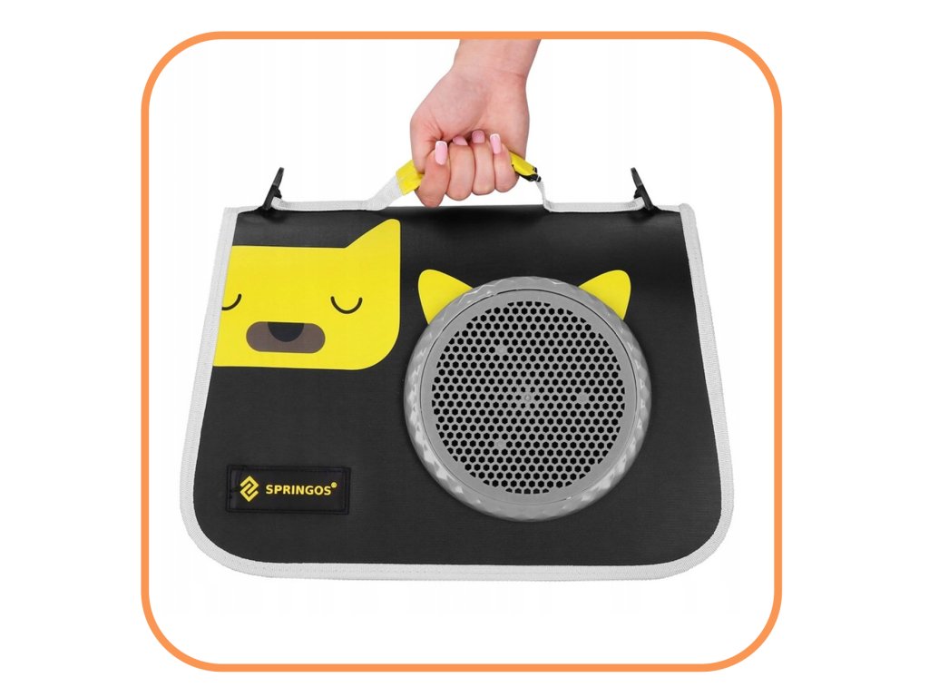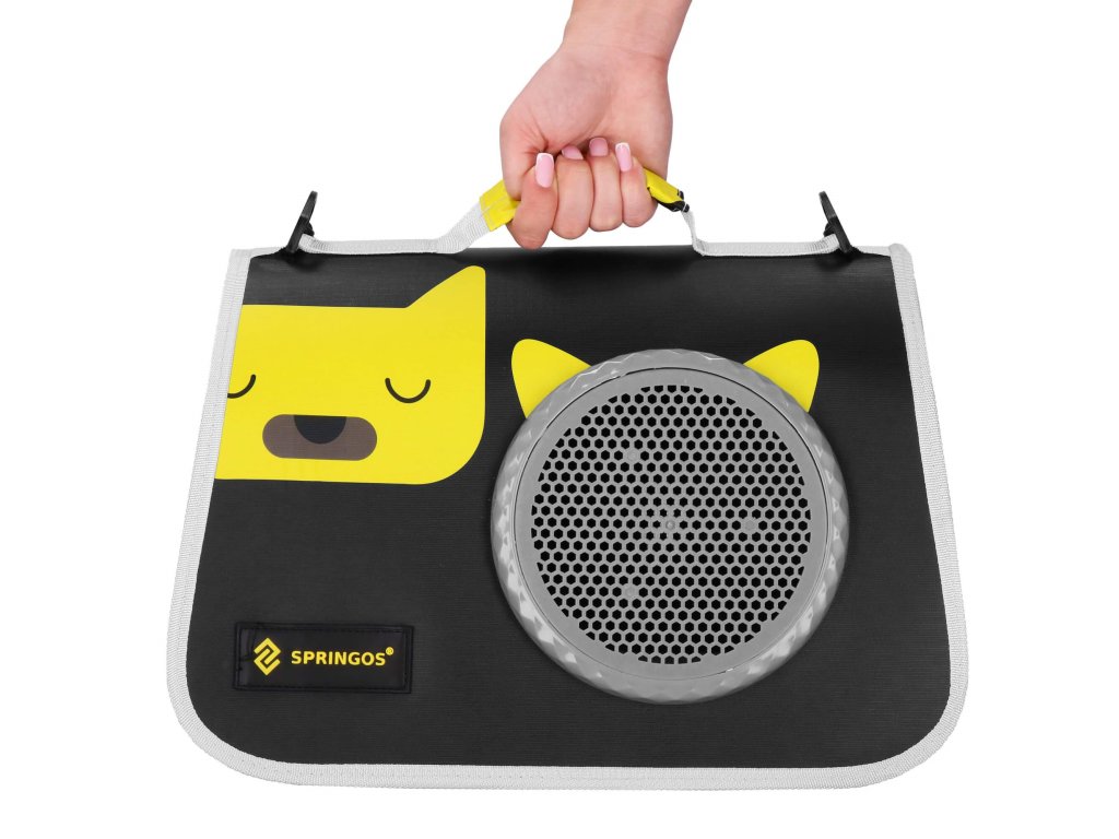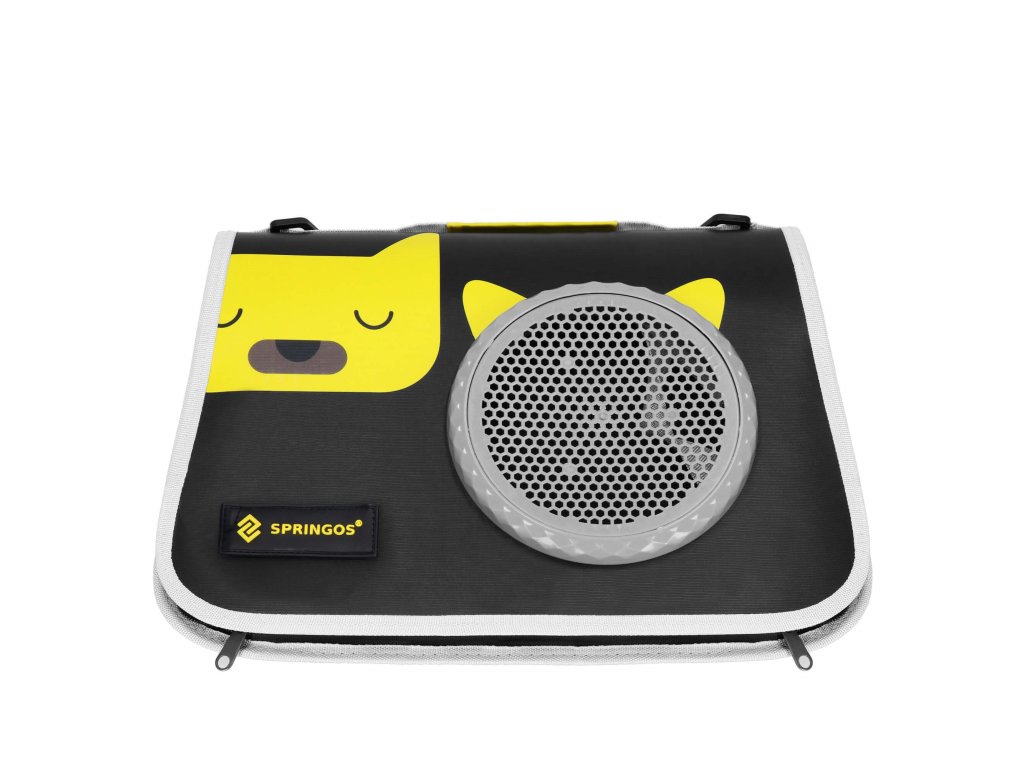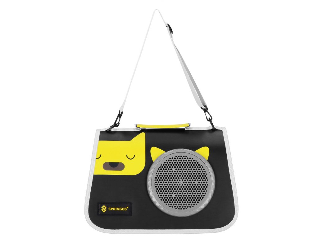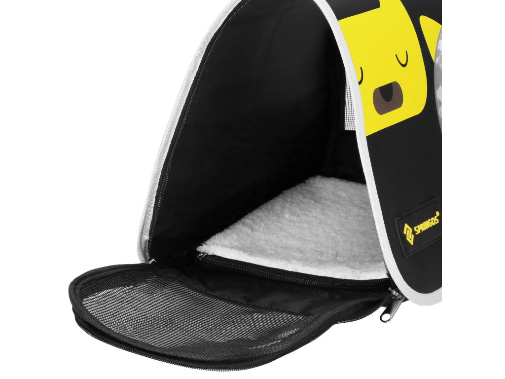 - Partea superioară este ușor întărită și se conectează cu pereții laterali și cu partea de jos printr-un fermoar bidirecțional. Pe partea din față are un imprimeu decorativ și un logo Springos cusut.