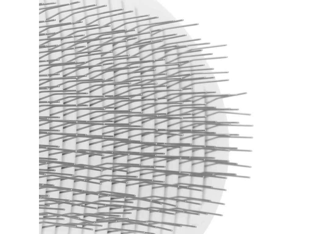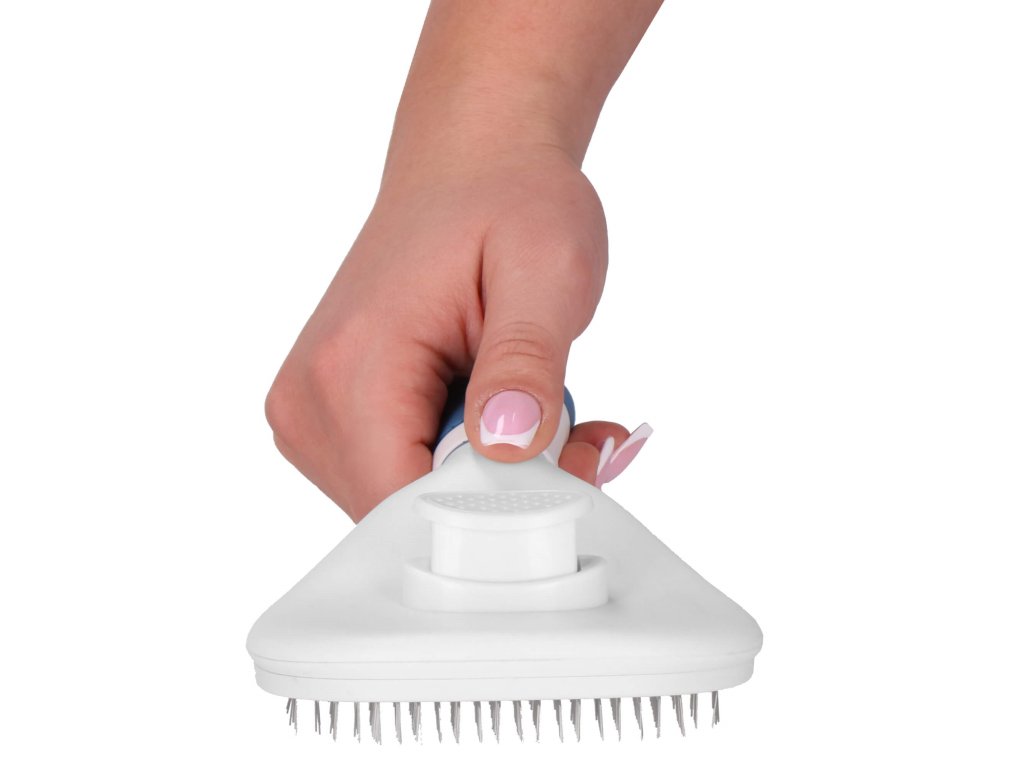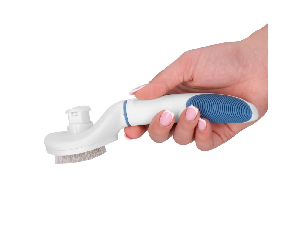 - Apăsarea butonului de pe spate face ca vârfurile să se retragă, permițând îndepărtarea rapidă și ușoară a părului acumulat de pe perie.