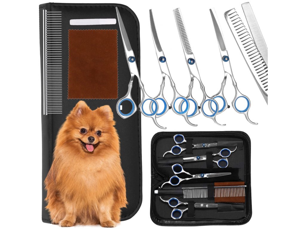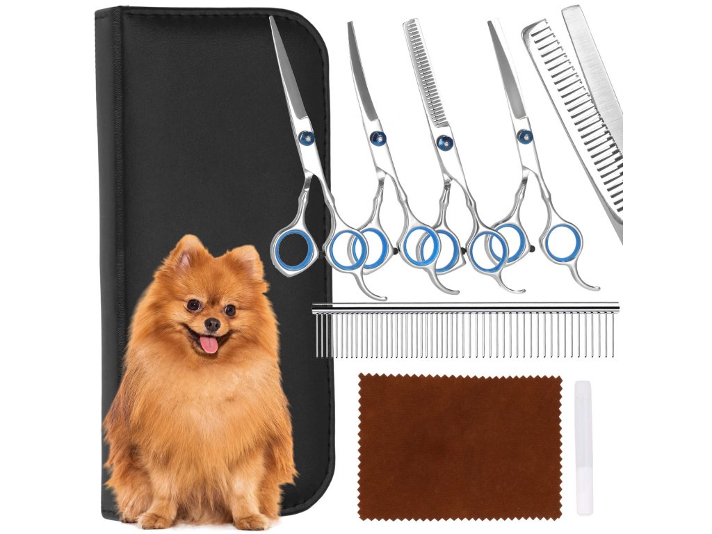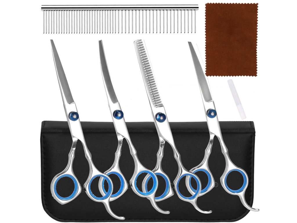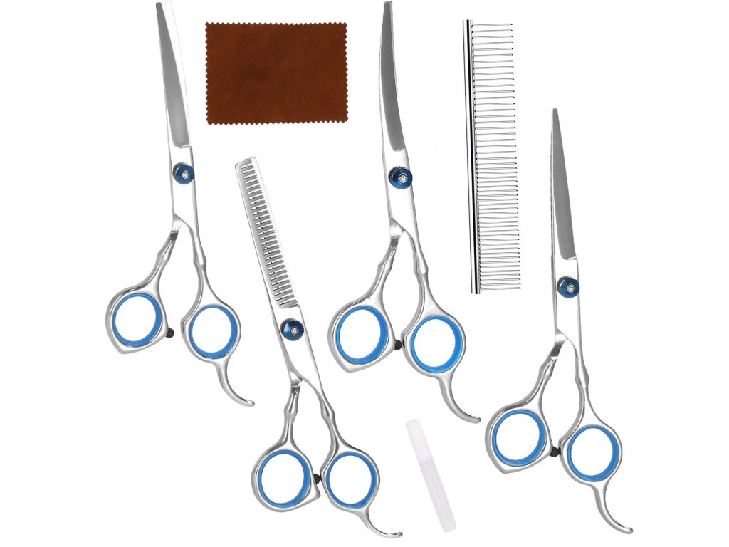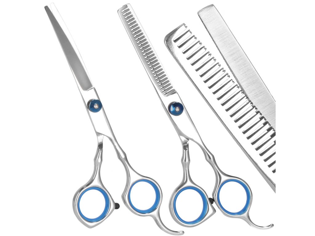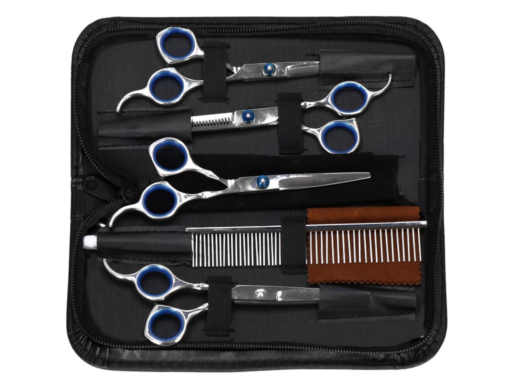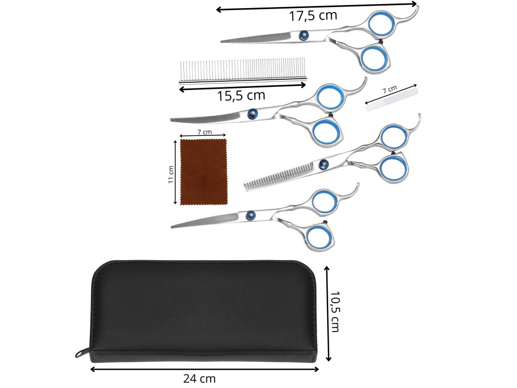 - Setul include: 4 tipuri de foarfece, pieptene, cârpă moale, ulei pentru întreținerea lamelor