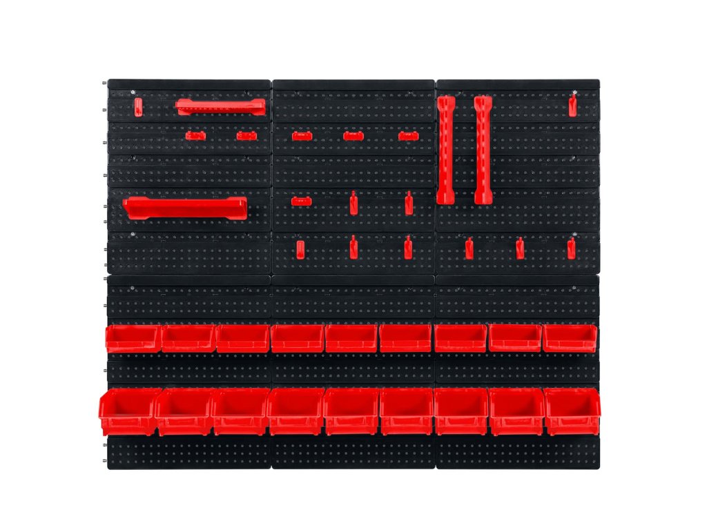 Set mare! 6 panouri modulare perforate și nu mai puțin de 43 de containere, suporturi, rafturi și cârlige adiționale.