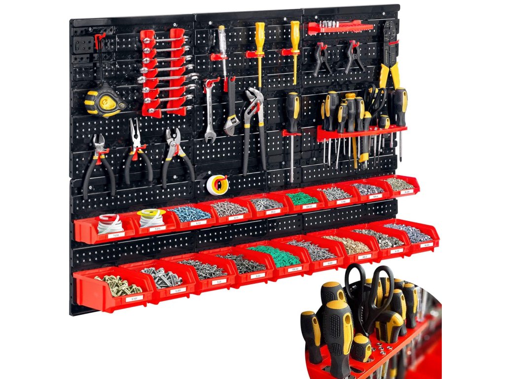 Tablă de atelier cu set complet de suporturi și containere este un element indispensabil în orice atelier.