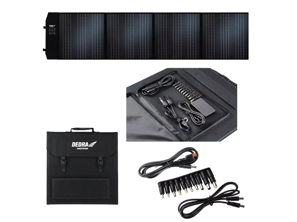 Panoul solar portabil DEZT0100 este un produs pentru încărcarea stațiilor electrice cu o putere de până la 1000 W, precum și a altor dispozitive, cum ar fi tabletele și smartphone-urile.
