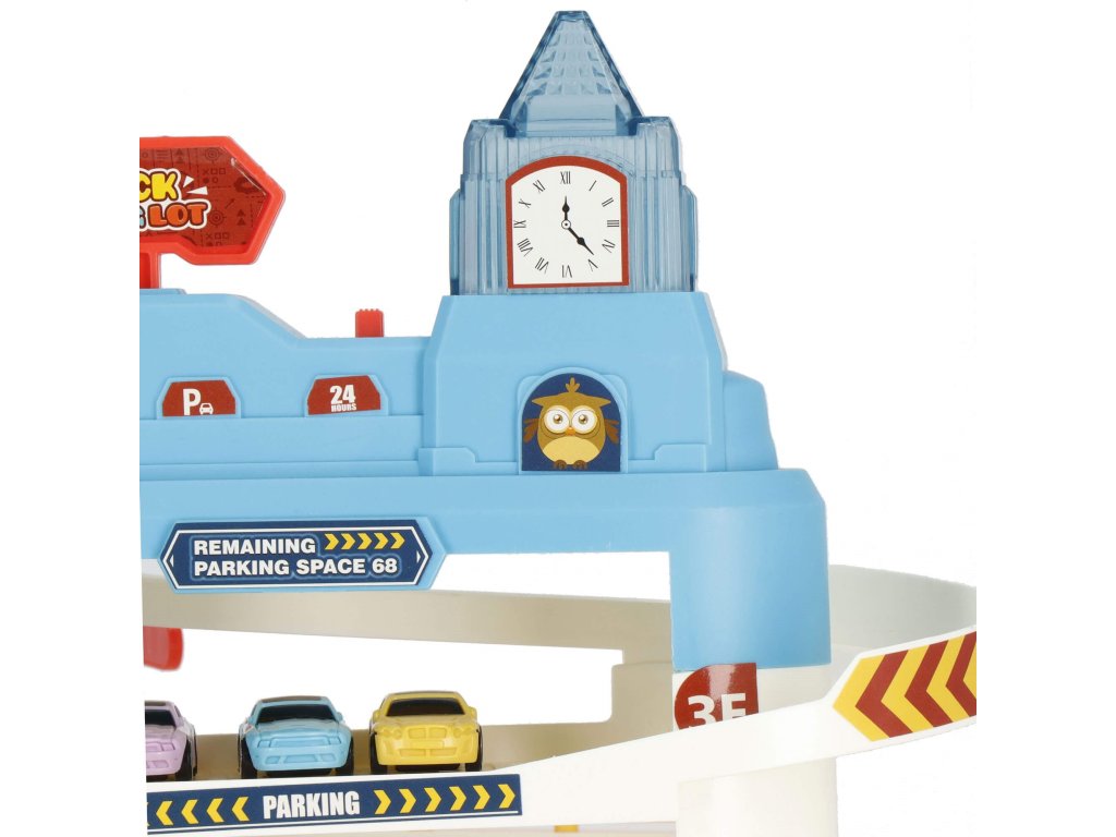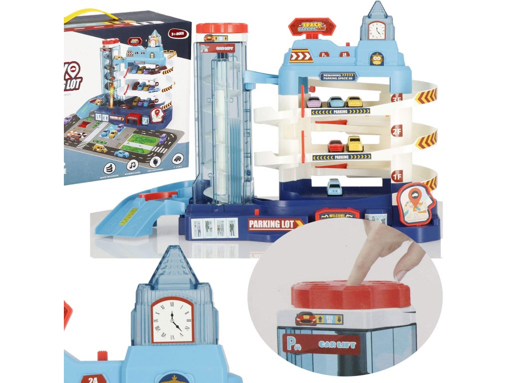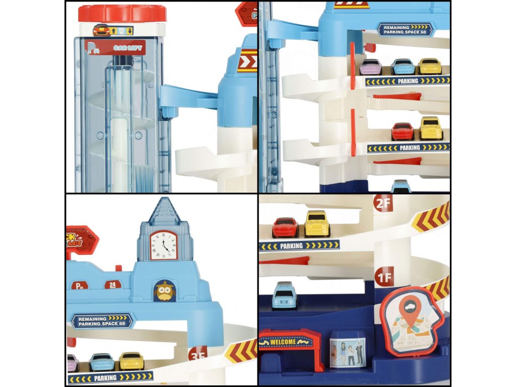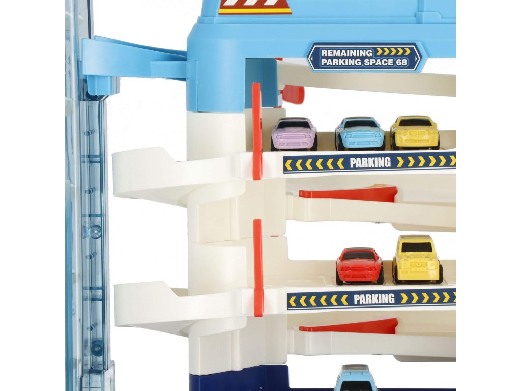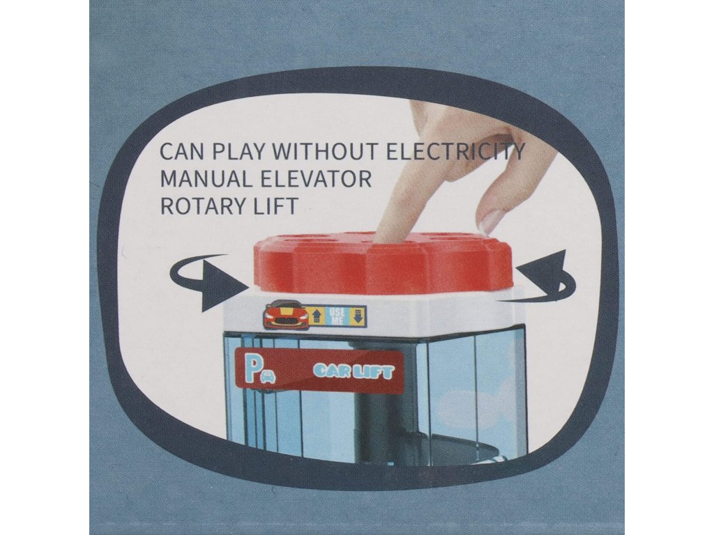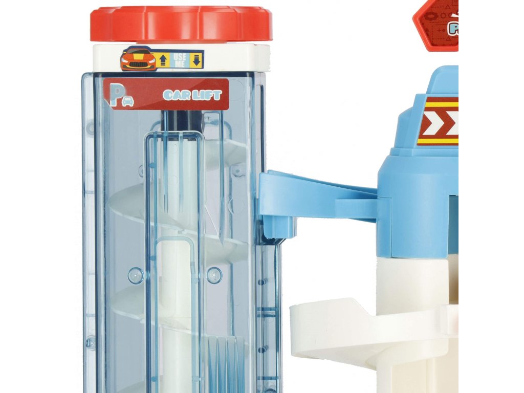 1 x secțiunea principală a parcării, are 3 etaje și un lift în spirală care ridică vehiculele la etaj. Liftul este sigur pentru copii, acoperit cu material acrilic transparent și vă permite să urmăriți progresul vehiculului. Liftul poate fi ridicat și manual folosind un buton în partea de sus. (alimentare 2 x baterii AA) - comutator independent