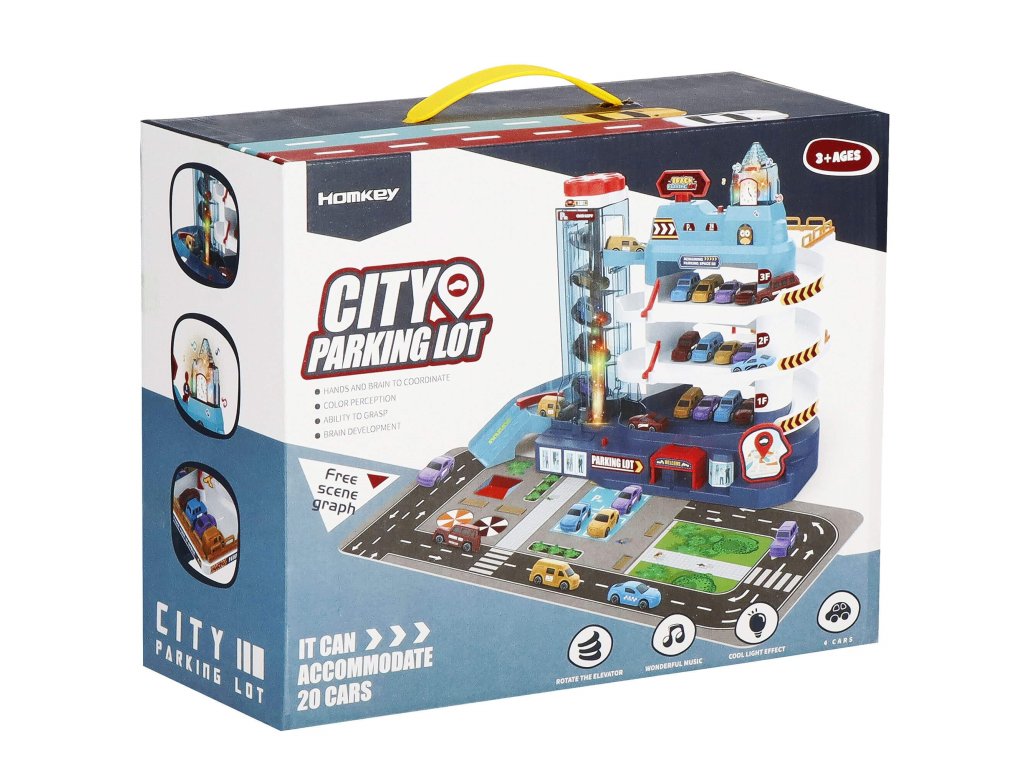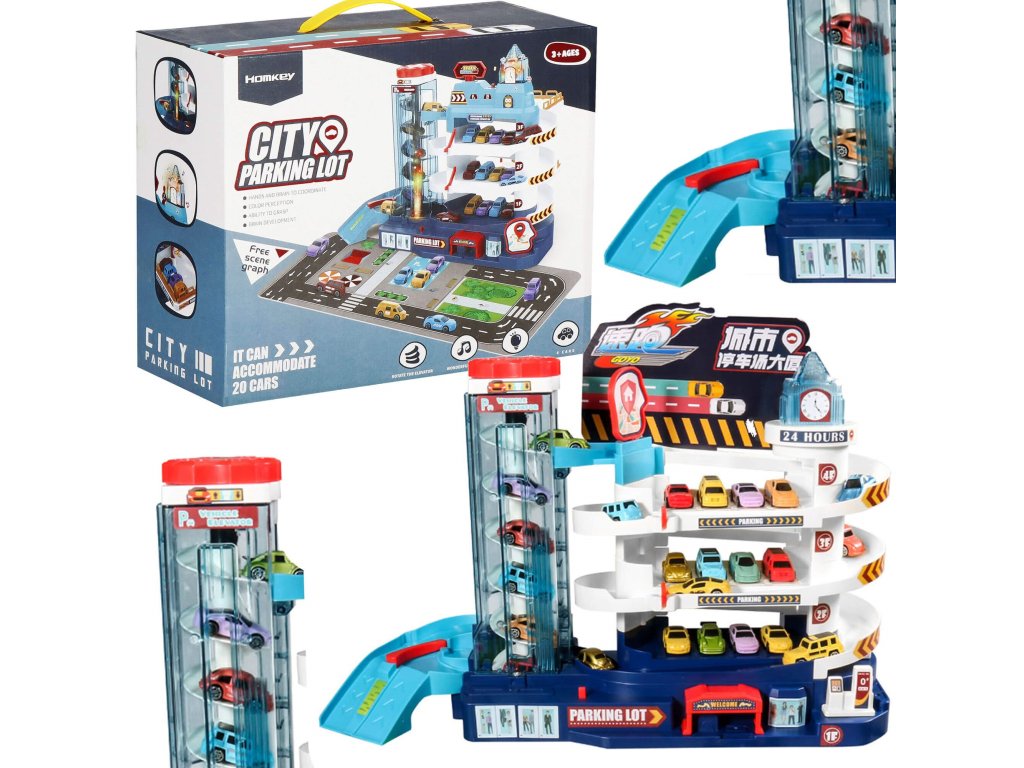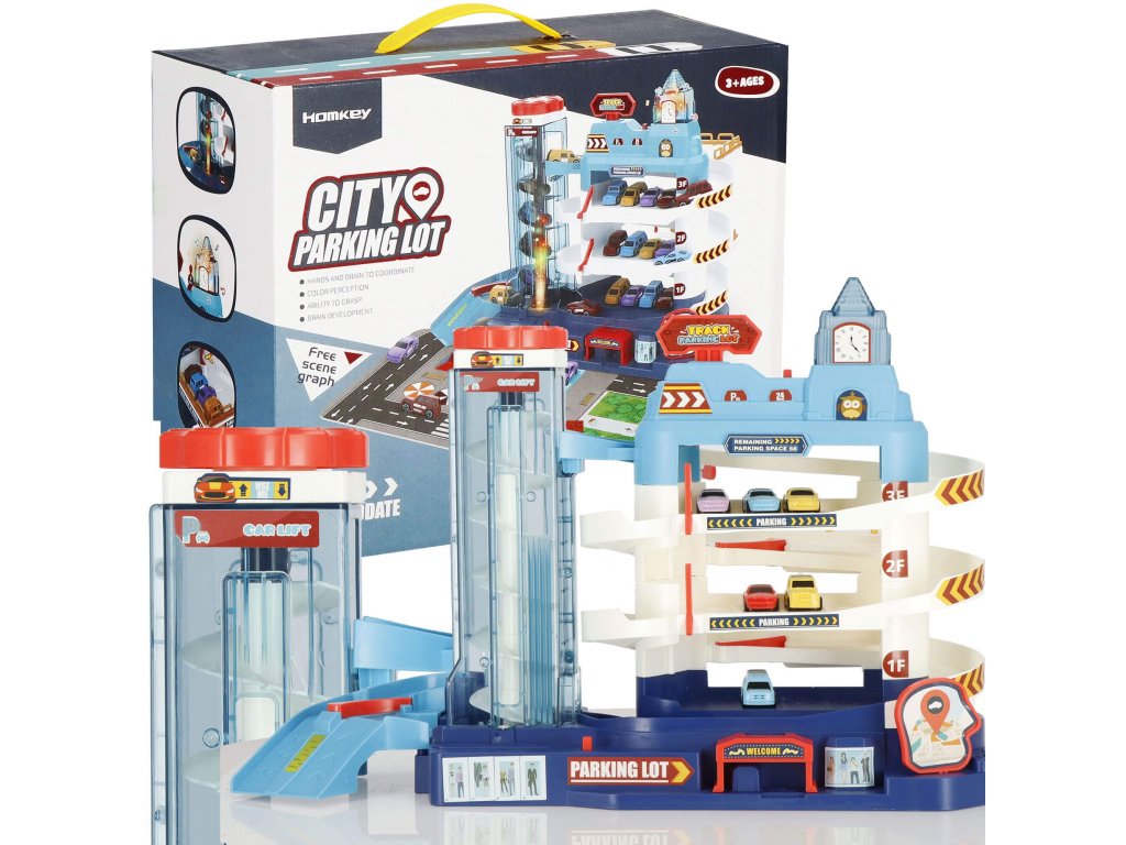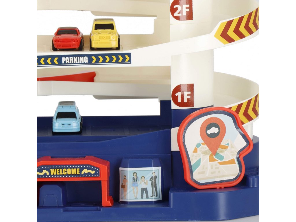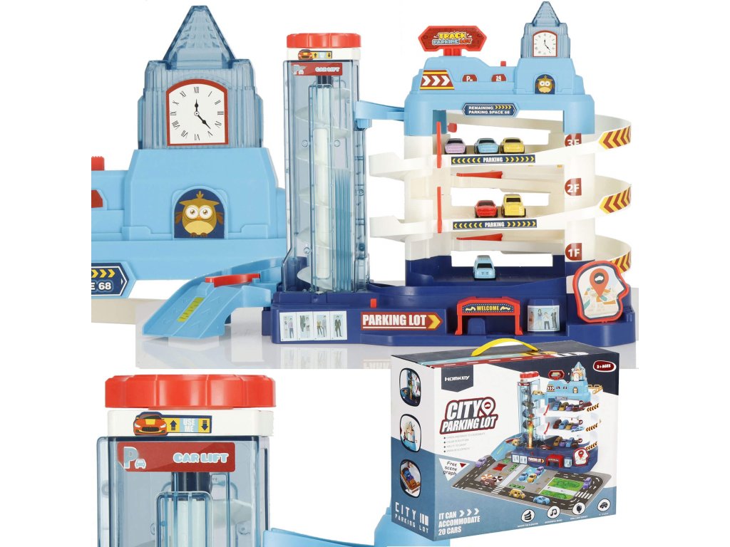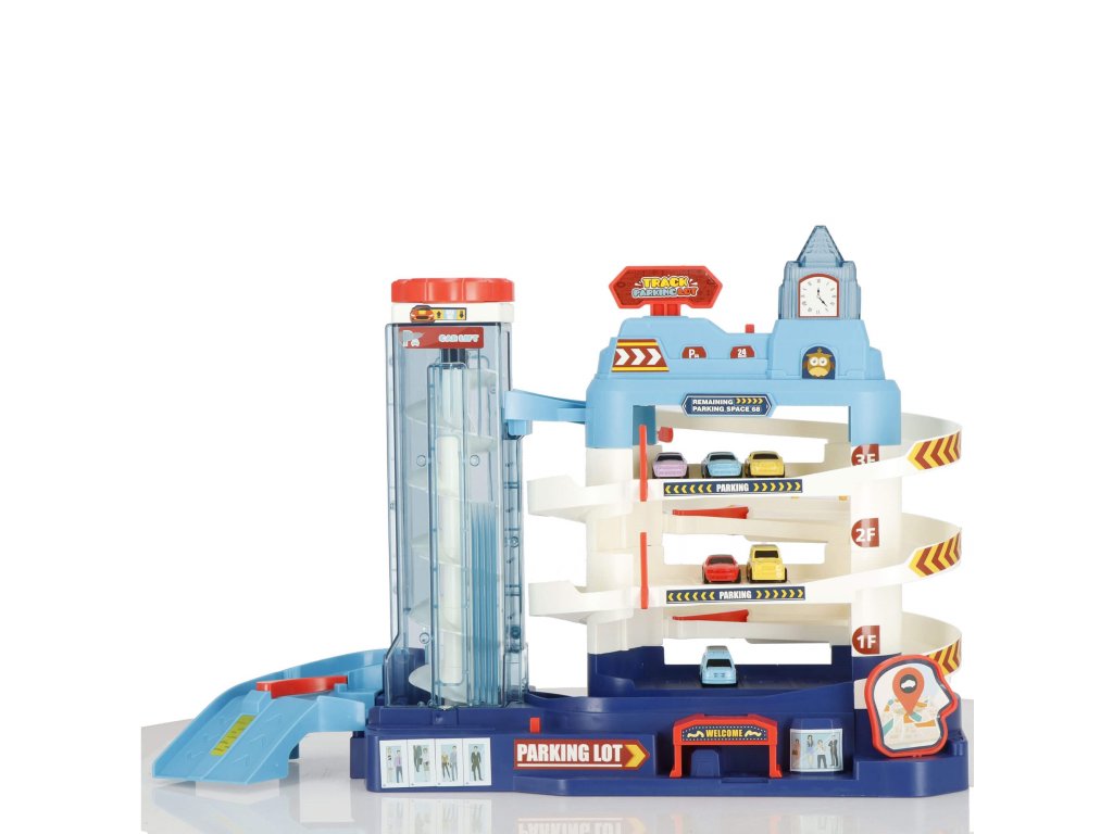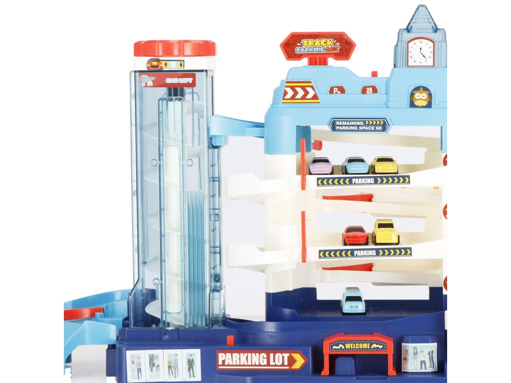 1 x secțiunea principală a parcării, are 3 etaje și un lift în spirală care ridică vehiculele la etaj. Liftul este sigur pentru copii, acoperit cu material acrilic transparent și vă permite să urmăriți progresul vehiculului. Liftul poate fi ridicat și manual folosind un buton în partea de sus. (alimentare 2 x baterii AA) - comutator independent